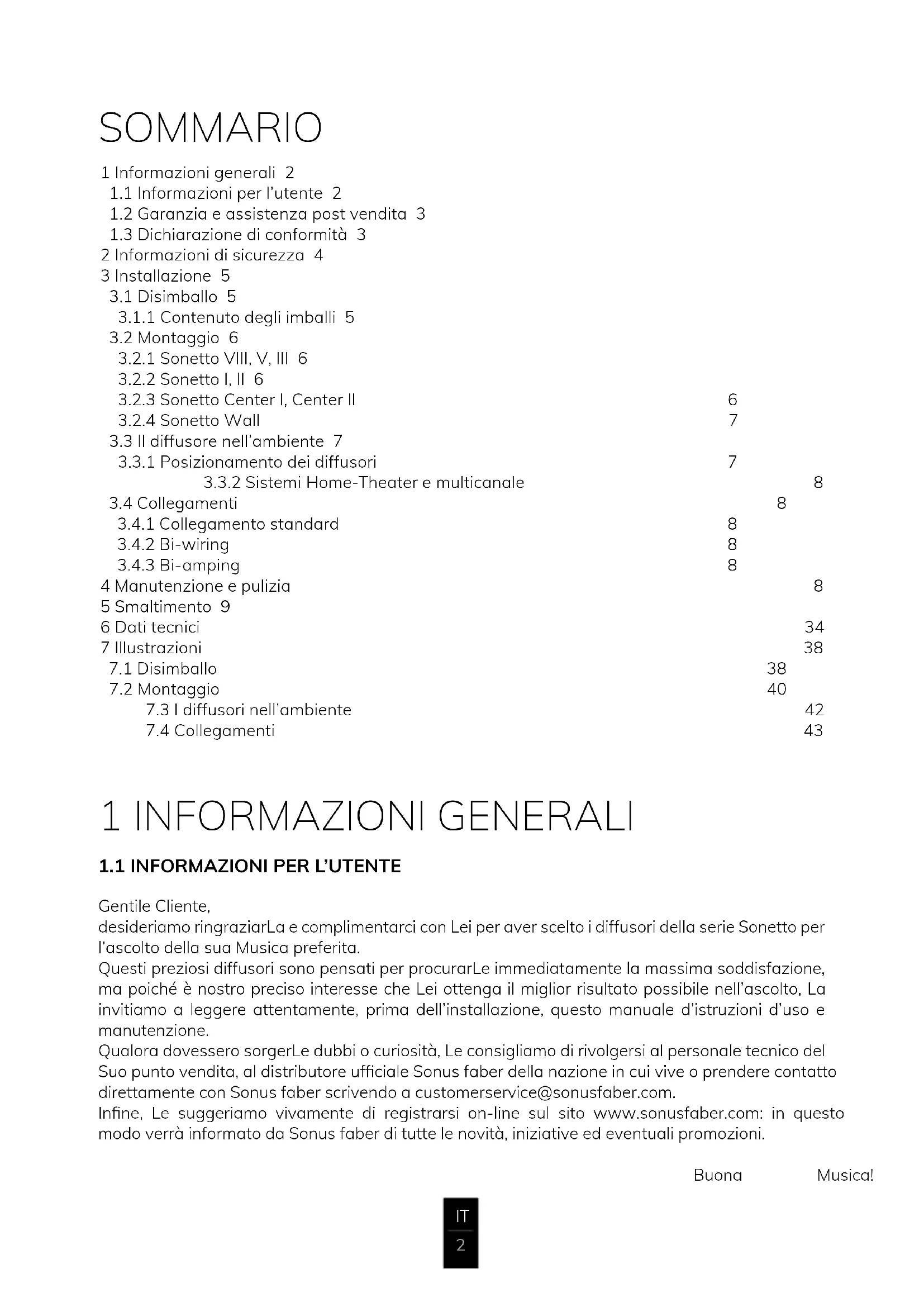 1 INFORMAZIONI GENERALI SOMMARIO Gentile Cliente, desideriamo ringraziarLa e complimentarci con Lei per aver scelto i diffusori della serie Sonetto per l’ascolto della sua Musica preferita. Questi preziosi diffusori sono pensati per procurarLe immediatamente la massima soddisfazione, ma poiché è nostro preciso interesse che Lei ottenga il miglior risultato possibile nell’ascolto, La invitiamo a leggere attentamente, prima dell’installazione, questo manuale d’istruzioni d’uso e manutenzione. Qualora dovessero sorgerLe dubbi o curiosità, Le consigliamo di rivolgersi al personale tecnico del Suo punto vendita, al distributore ufciale Sonus faber della nazione in cui vive o prendere contatto direttamente con Sonus faber scrivendo a customerservice@sonusfaber.com. Inne, Le suggeriamo vivamente di registrarsi on-line sul sito www.sonusfaber.com: in questo modo verrà informato da Sonus faber di tutte le novità, iniziative ed eventuali promozioni. Buona Musica! 1 Informazioni generali 2