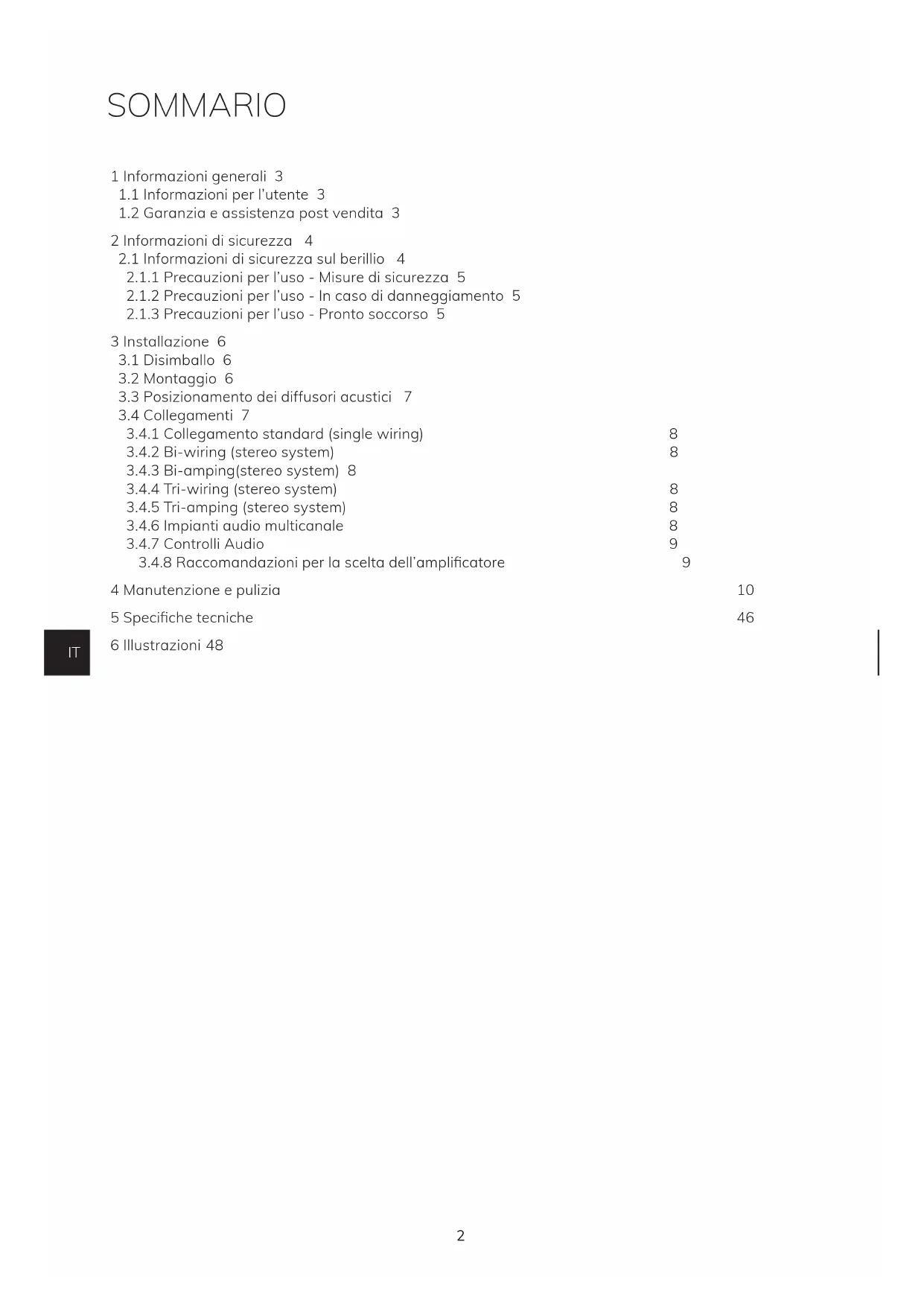 1 INFORMAZIONI GENERALI Gentile Cliente, desideriamo ringraziarLa e complimentarci con Lei per aver scelto i diffusori acustici Sonus faber per l’ascolto della sua Musica preferita. Questi preziosi diffusori acustici sono pensati per procurarLe immediatamente la massima soddisfazione, mapoichéènostroprecisointeressecheLeiottengailmigliorrisultatopossibilenell’ascolto,Lainvitiamoa leggere attentamente, prima dell’installazione, questo manuale d’istruzioni d’uso e manutenzione. Qualora dovessero sorgerLe dubbi o curiosità, Le consigliamo di rivolgersi al personale tecnico del Suo puntovendita,aldistributoreufcialeSonusfaberdellanazioneincuiviveoprenderecontattodirettamente con Sonus faber scrivendo a customerservice@sonusfaber.com. Inne,Lesuggeriamovivamentediregistrarsion-linesulsitowww.sonusfaber.com:inquestomodoverrà informato da Sonus faber di tutte le novità, iniziative ed eventuali promozioni. Buona musica! I nostri diffusori acustici sono stati progettati e fabbricati secondo i più alti standard qualitativi. Tuttavia, nella remota ipotesi in cui si manifestasse un guasto o malfunzionamento, i diffusori sono comunque coperti da garanzia secondo i termini previsti dalla legislazione vigente nel Paese dove sono stati acquistati. In tal caso, invitiamo il possessore a rivolgersi al rivenditore Sonus faber presso cuihaeffettuatol’acquistooaldistributoreufcialeSonusfaberdelsuopaese;tuttiicontattideidistributori sonodisponibilisulnostrosito: