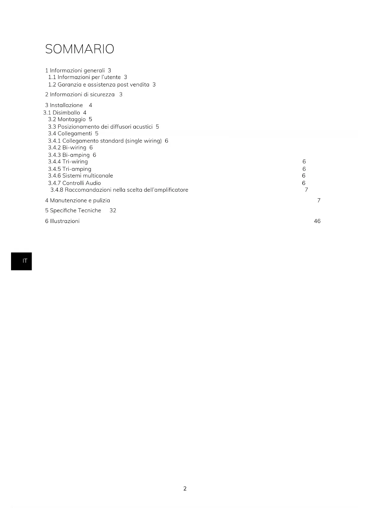 1 INFORMAZIONI GENERALI Gentile Cliente, desideriamo ringraziarLa e complimentarci con Lei per aver scelto i diffusori acustici Sonus faber per l’ascolto della sua Musica preferita. Questi preziosi diffusori acustici sono pensati per procurarLe immediatamente la massima soddisfazione, mapoichéènostroprecisointeressecheLeiottengailmigliorrisultatopossibilenell’ascolto, La invitiamo a leggere attentamente, prima dell’installazione, questo manuale d’istruzioni d’uso e manutenzione. Qualora dovessero sorgerLe dubbi o curiosità, Le consigliamo di rivolgersi al personale tecnico del Suo puntovendita,aldistributoreufcialeSonusfaberdellanazioneincuiviveoprenderecontattodirettamentecon Sonus faber scrivendo a customerservice@sonusfaber.com. Inne,Lesuggeriamovivamentediregistrarsion-linesulsitowww.sonusfaber.com:inquestomodoverrà informato da Sonus faber di tutte le novità, iniziative ed eventuali promozioni. Buona musica!