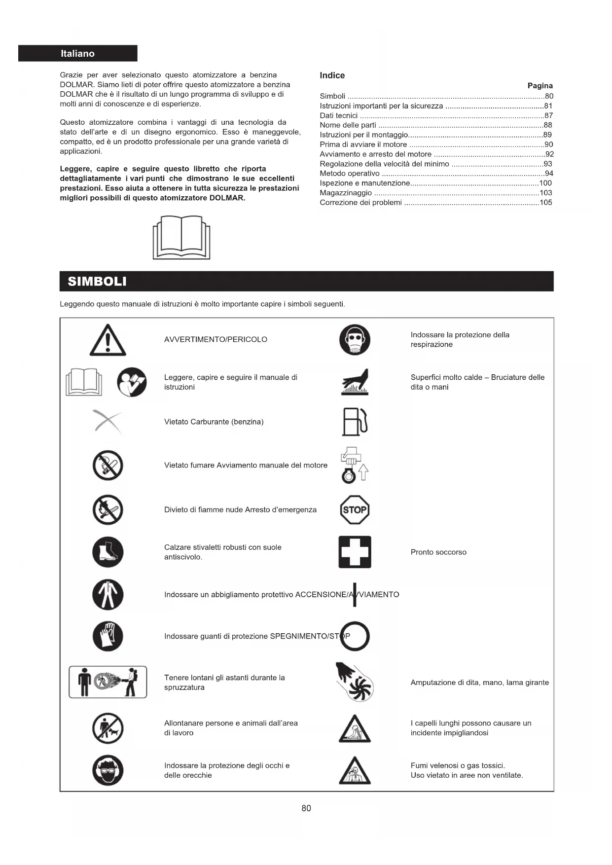 - Grazie per aver selezionato questo atomizzatore a benzina DOLMAR. Siamo lieti di poter offrire questo atomizzatore a benzina DOLMAR che è il risultato di un lungo programma di sviluppo e di molti anni di conoscenze e di esperienze. Questo atomizzatore combina i vantaggi di una tecnologia da stato dell’arte e di un disegno ergonomico. Esso è maneggevole, compatto, ed è un prodotto professionale per una grande varietà di applicazioni. Leggere, capire e seguire questo libretto che riporta dettagliatamente i vari punti che dimostrano le sue eccellenti prestazioni. Esso aiuta a ottenere in tutta sicurezza le prestazioni migliori possibili di questo atomizzatore DOLMAR. Italiano SIMBOLI Leggendo questo manuale di istruzioni è molto importante capire i simboli seguenti. AVVERTIMENTO/PERICOLO Indossare la protezione della respirazione Leggere, capire e seguire il manuale di istruzioni Superci molto calde – Bruciature delle dita o mani Vietato Carburante (benzina) Vietato fumare Avviamento manuale del motore Divieto di amme nude Arresto d’emergenza Calzare stivaletti robusti con suole antiscivolo. Pronto soccorso Indossare un abbigliamento protettivo ACCENSIONE/AVVIAMENTO Indossare guanti di protezione SPEGNIMENTO/STOP Tenere lontani gli astanti durante la spruzzatura Amputazione di dita, mano, lama girante Allontanare persone e animali dall’area di lavoro I capelli lunghi possono causare un incidente impigliandosi Indossare la protezione degli occhi e delle orecchie Fumi velenosi o gas tossici. Uso vietato in aree non ventilate. Indice Pagina Simboli p. 80