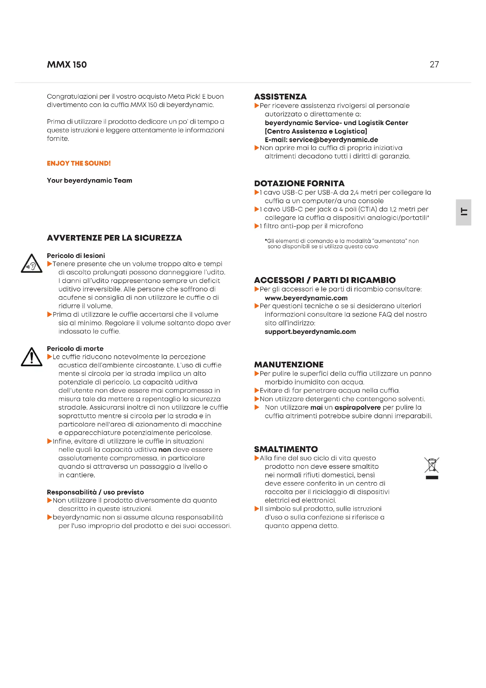u Per gli accessori e le pai di ricambio consultare: www.beyerdynamic.com u Per queioni tecniche o se si desiderano ulteriori informazioni consultare la sezione FAQ del noro sito all’indirizzo: suppo.beyerdynamic.com DOTAZIONE FORNITA u 1 cavo USB-C per USB-A da 2,4 metri per collegare la cuia a un computer/a una console u 1 cavo USB-C per jack a 4 poli (CTIA) da 1,2 metri per collegare la cuia a dispositivi analogici/poatili* u 1 filtro anti-pop per il microfono *Gli elementi di comando e la modalità “aumentata” non sono disponibili se si utilizza queo cavo ASSISTENZA u Per ricevere assienza rivolgersi al personale autorizzato o direttamente a: beyerdynamic Service- und Logistik Center [Centro Assistenza e Logistica] E-mail: service@beyerdynamic.de u Non aprire mai la cuia di propria iniziativa altrimenti decadono tutti i diritti di garanzia.28 MMX 150