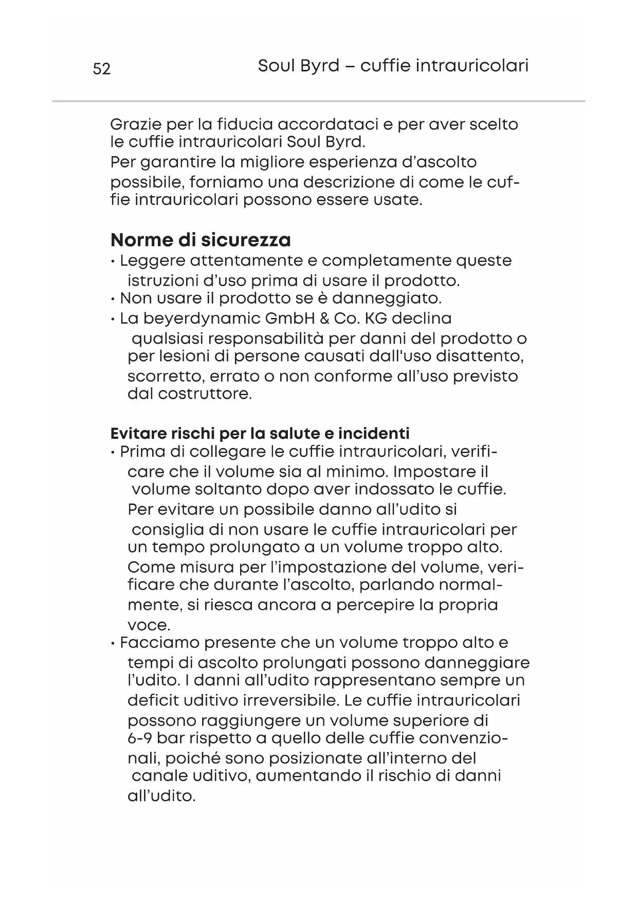 - Non utilizzare il prodotto in modo diverso da quanto descritto nelle presenti iruzioni. beyerdynamic non si assume alcuna responsabilità per l'uso improprio del prodotto e dei suoi accessori.italiano Soul Byrd – cuffie intrauricolari