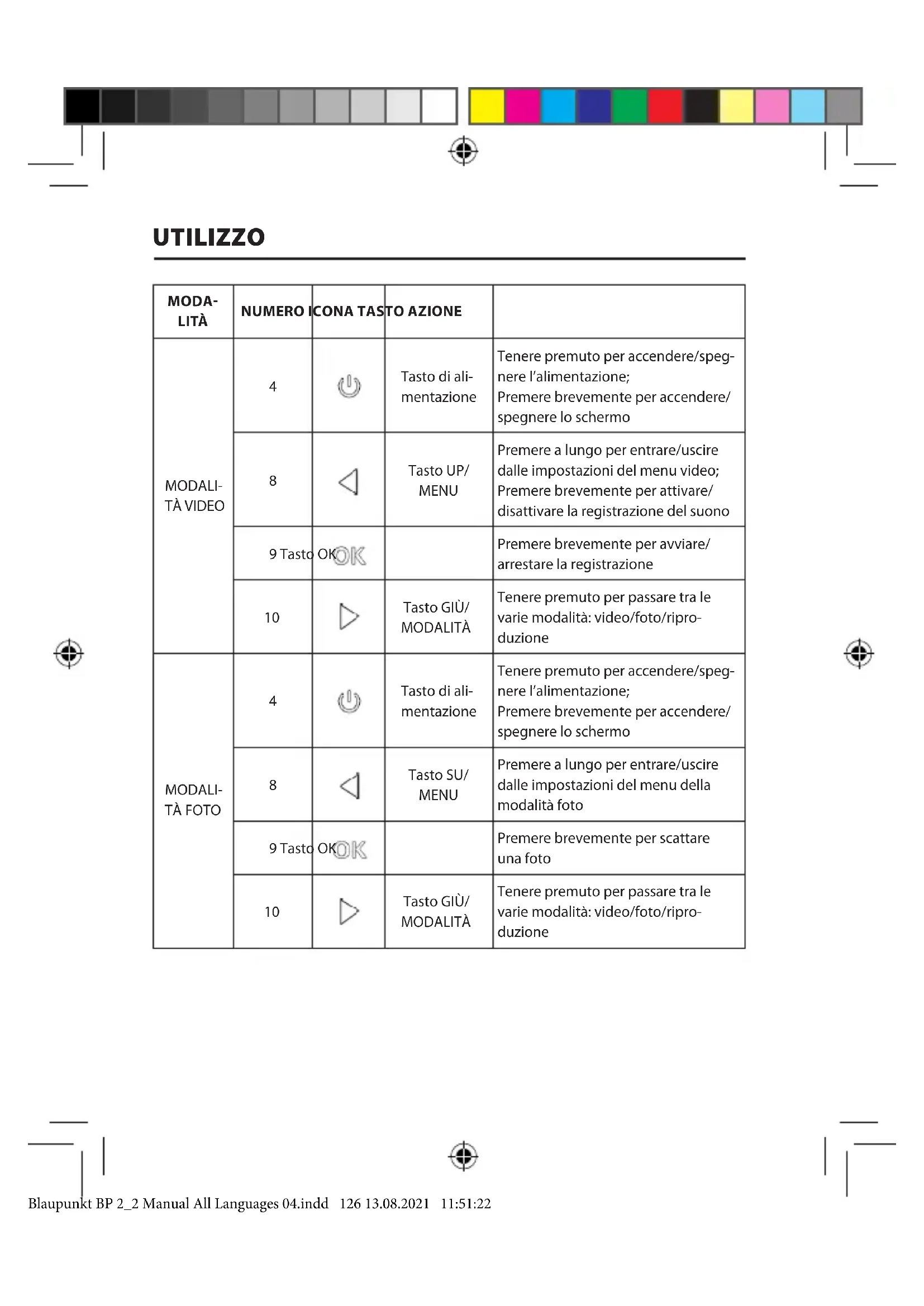 Tasto GIÙ/ MODALITÀ Tenere premuto per passare tra le varie modalità: video/foto/ripro- duzione UTILIZZO Blaupunkt BP 2_2 Manual All Languages 04.indd 126 13.08.2021 11:51:22MODALITÀ NUMERO ICONA TASTO AZIONE MODALITÀ RIPRODUZI- ONE