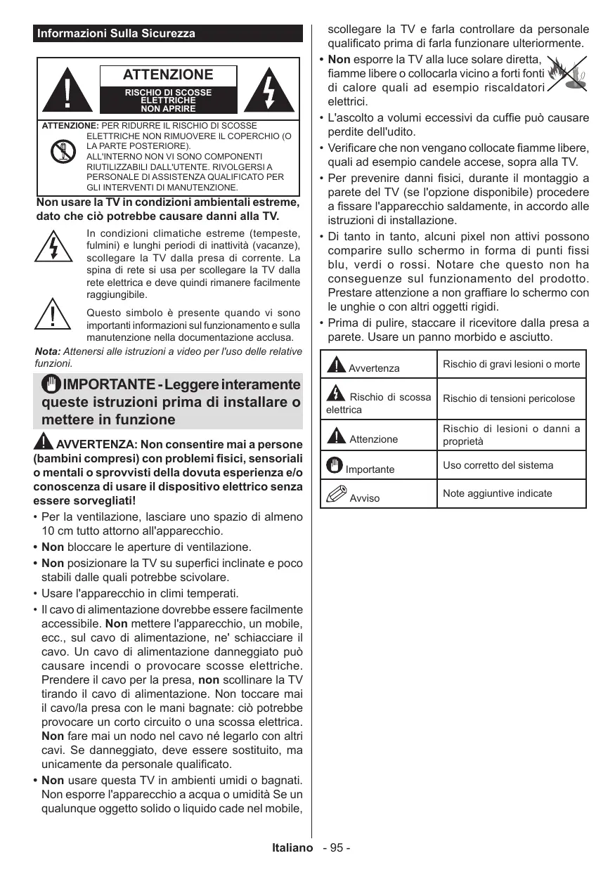 scollegare la TV e farla controllare da personale qualificato prima di farla funzionare ulteriormente. Non esporre la TV alla luce solare diretta, fiamme libere o collocarla vicino a forti fonti di calore quali ad esempio riscaldatori elettrici. L'ascolto a volumi eccessivi da cuffie può causare perdite dell'udito. Verificare che non vengano collocate fiamme libere, quali ad esempio candele accese, sopra alla TV. Per prevenire danni fisici, durante il montaggio a parete del TV (se l'opzione disponibile) procedere a fissare l'apparecchio saldamente, in accordo alle istruzioni di installazione. Di tanto in tanto, alcuni pixel non attivi possono comparire sullo schermo in forma di punti fissi blu, verdi o rossi. Notare che questo non ha conseguenze sul funzionamento del prodotto. Prestare attenzione a non graffiare lo schermo con le unghie o con altri oggetti rigidi. Prima di pulire, staccare il ricevitore dalla presa a parete. Usare un panno morbido e asciutto. Avvertenza Rischio di scossa elettrica Attenzione Importante Avviso