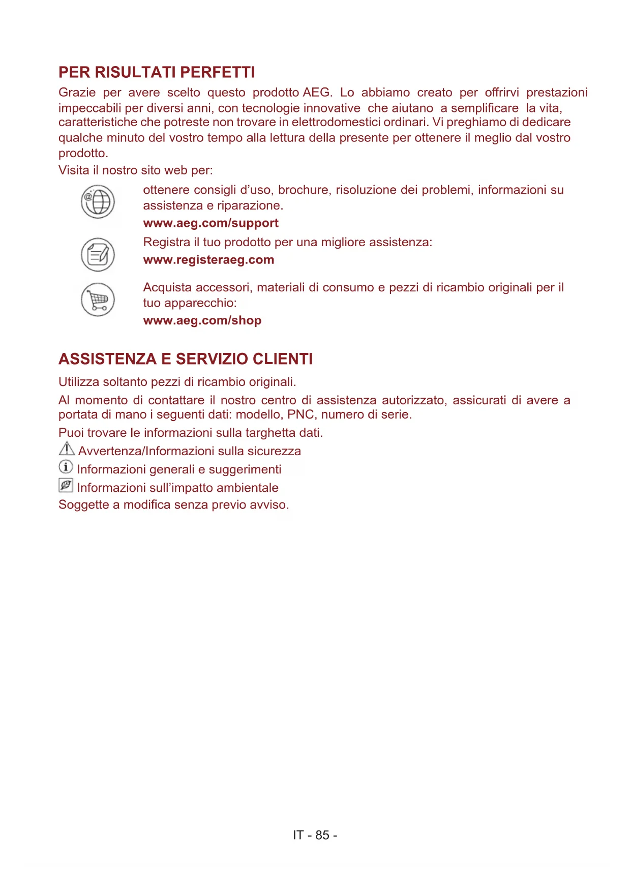 Grazie per avere scelto questo prodotto AEG. Lo abbiamo creato per orirvi prestazioni impeccabili per diversi anni, con tecnologie innovative che aiutano a semplicare la vita, caratteristiche che potreste non trovare in elettrodomestici ordinari. Vi preghiamo di dedicare qualche minuto del vostro tempo alla lettura della presente per ottenere il meglio dal vostro prodotto. Visita il nostro sito web per: ottenere consigli d’uso, brochure, risoluzione dei problemi, informazioni su assistenza e riparazione. www.aeg.com/support Registra il tuo prodotto per una migliore assistenza: www.registeraeg.com Acquista accessori, materiali di consumo e pezzi di ricambio originali per il tuo apparecchio: www.aeg.com/shop