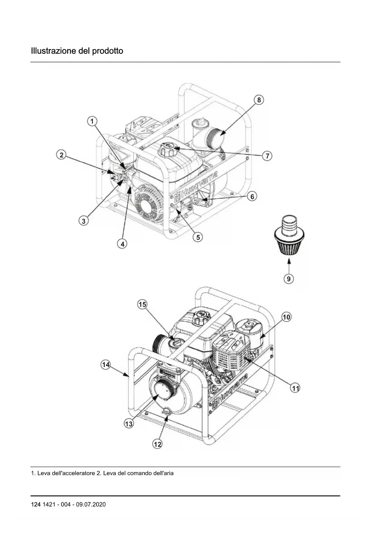 - Dichiarazione di conformità CE Introduzione Descrizione del prodotto Il prodotto è una pompa per il trasporto dell'acqua. Uso previsto Il prodotto viene utilizzato per scaricare o fornire acqua pulita da e verso un determinato luogo. Non utilizzare il prodotto per altre attività. 1421 - 004 - 09.07.2020 123Illustrazione del prodotto p. 139