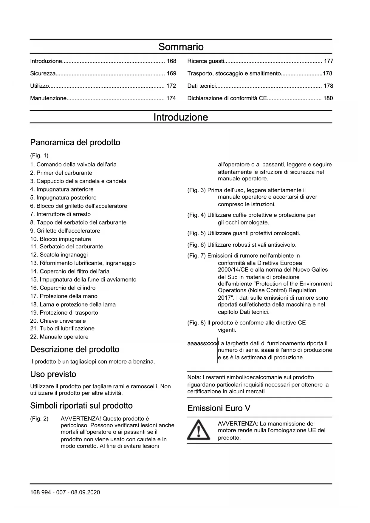 Descrizione del prodotto Il prodotto è un tagliasiepi con motore a benzina. Uso previsto Utilizzare il prodotto per tagliare rami e ramoscelli. Non utilizzare il prodotto per altre attività. Simboli riportati sul prodotto (Fig. 2) AVVERTENZA! Questo prodotto è pericoloso. Possono verificarsi lesioni anche mortali all'operatore o ai passanti se il prodotto non viene usato con cautela e in modo corretto. Al fine di evitare lesioni all'operatore o ai passanti, leggere e seguire attentamente le istruzioni di sicurezza nel manuale operatore. (Fig. 3) Prima dell'uso, leggere attentamente il manuale operatore e accertarsi di aver compreso le istruzioni. (Fig. 4) Utilizzare cuffie protettive e protezione per gli occhi omologate. (Fig. 5) Utilizzare guanti protettivi omologati. (Fig. 6) Utilizzare robusti stivali antiscivolo. (Fig. 7) Emissioni di rumore nell'ambiente in conformità alla Direttiva Europea 2000/14/CE e alla norma del Nuovo Galles del Sud in materia di protezione dell'ambiente "Protection of the Environment Operations (Noise Control) Regulation 2017". I dati sulle emissioni di rumore sono riportati sull'etichetta della macchina e nel capitolo Dati tecnici. (Fig. 8) Il prodotto è conforme alle direttive CE vigenti. aaaassxxxxLa targhetta dati di funzionamento riporta il numero di serie. aaaa è l'anno di produzione e ss è la settimana di produzione. Nota: I restanti simboli/decalcomanie sul prodotto riguardano particolari requisiti necessari per ottenere la certificazione in alcuni mercati. Emissioni Euro V AVVERTENZA: La manomissione del motore rende nulla l'omologazione UE del prodotto. 168 994 - 007 - 08.09.2020Sicurezza Definizioni di sicurezza Le avvertenze, le precauzioni e le note sono utilizzate per evidenziare le parti importanti del manuale. AVVERTENZA: Utilizzato se è presente un rischio di lesioni o morte dell'operatore o di passanti nel caso in cui le istruzioni del manuale non vengano rispettate. ATTENZIONE: Utilizzato se è presente un rischio di danni al prodotto, ad altri materiali oppure alla zona adiacente nel caso in cui le istruzioni del manuale non vengano rispettate. Nota: Utilizzato per fornire ulteriori informazioni necessarie in una determinata situazione. Istruzioni di sicurezza generali AVVERTENZA: Leggere le seguenti avvertenze prima di utilizzare il prodotto.