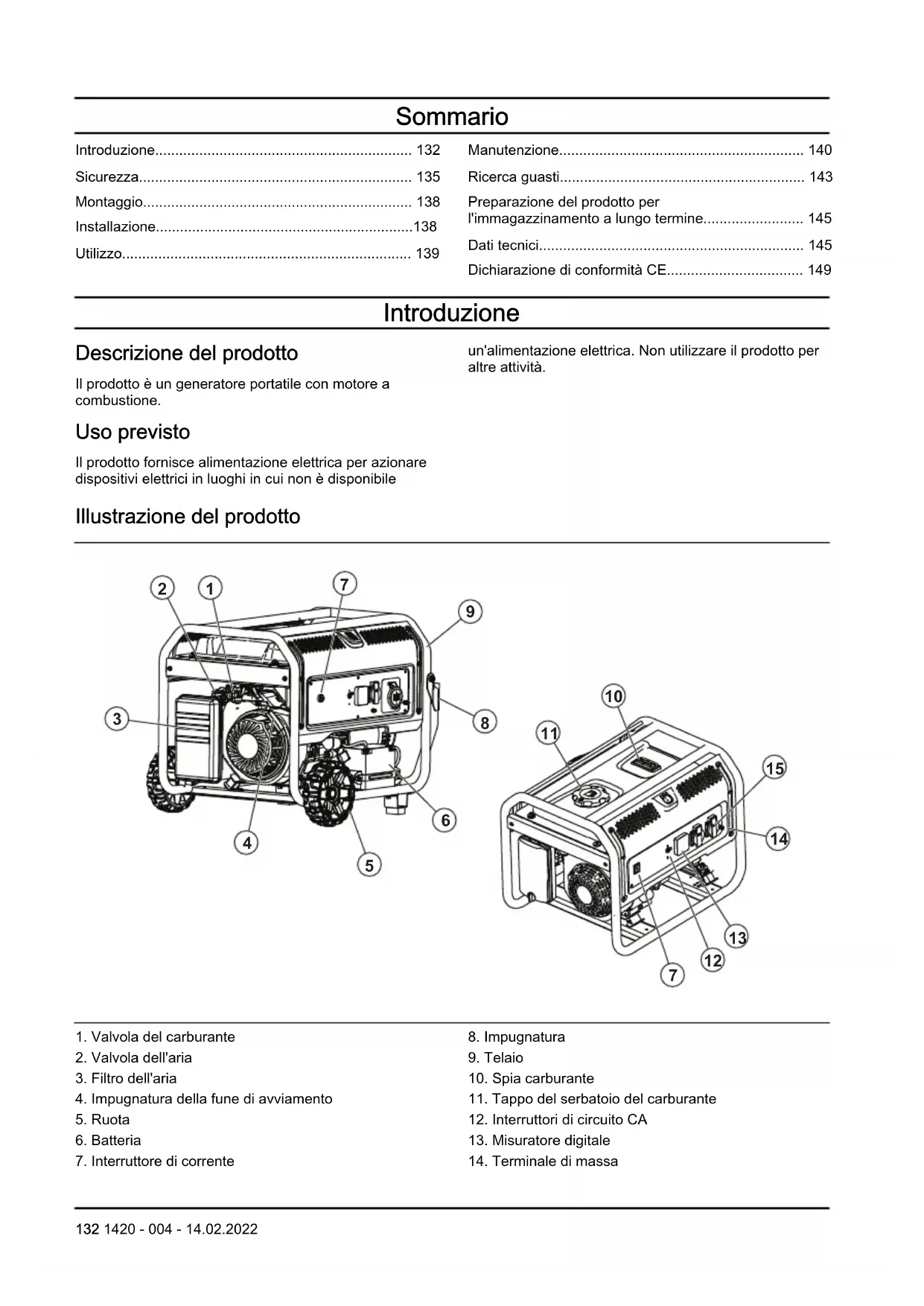 - Dichiarazione di conformità CE Introduzione Descrizione del prodotto Il prodotto è un generatore portatile con motore a combustione. Uso previsto Il prodotto fornisce alimentazione elettrica per azionare dispositivi elettrici in luoghi in cui non è disponibile un'alimentazione elettrica. Non utilizzare il prodotto per altre attività. Illustrazione del prodotto p. 149