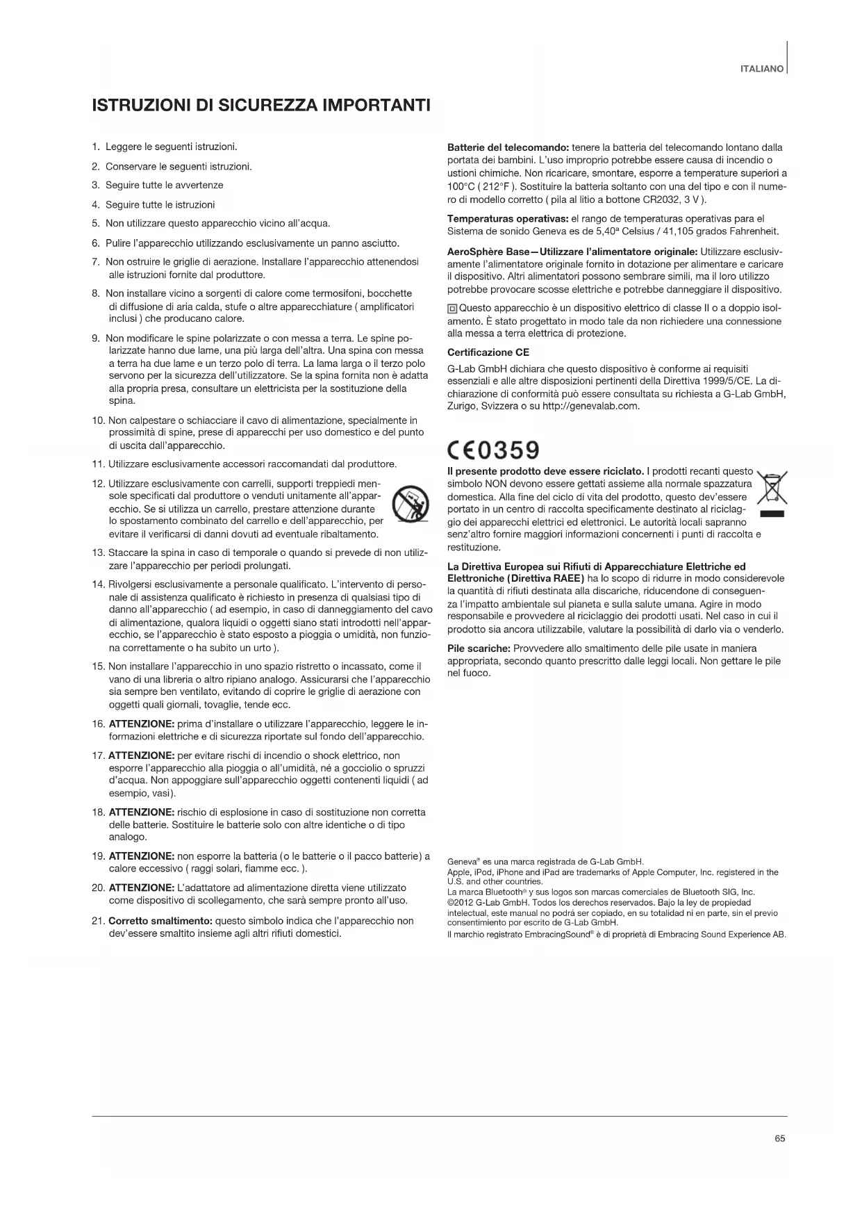 dev’essere smaltito insieme agli altri rifiuti domestici. Batterie del telecomando: tenere la batteria del telecomando lontano dalla portata dei bambini. L’uso improprio potrebbe essere causa di incendio o ustioni chimiche. Non ricaricare, smontare, esporre a temperature superiori a 100°C ( 212°F ). Sostituire la batteria soltanto con una del tipo e con il nume- ro di modello corretto ( pila al litio a bottone CR2032, 3 V ). Temperaturas operativas: el rango de temperaturas operativas para el Sistema de sonido Geneva es de 5,40ª Celsius / 41,105 grados Fahrenheit. AeroSphère Base—Utilizzare l’alimentatore originale: Utilizzare esclusiv- amente l’alimentatore originale fornito in dotazione per alimentare e caricare il dispositivo. Altri alimentatori possono sembrare simili, ma il loro utilizzo potrebbe provocare scosse elettriche e potrebbe danneggiare il dispositivo. Questo apparecchio è un dispositivo elettrico di classe II o a doppio isol- amento. È stato progettato in modo tale da non richiedere una connessione alla messa a terra elettrica di protezione. Certificazione CE G-Lab GmbH dichiara che questo dispositivo è conforme ai requisiti essenziali e alle altre disposizioni pertinenti della Direttiva 1999/5/CE. La di- chiarazione di conformità può essere consultata su richiesta a G-Lab GmbH, Zurigo, Svizzera o su http://genevalab.com. Il presente prodotto deve essere riciclato. I prodotti recanti questo simbolo NON devono essere gettati assieme alla normale spazzatura domestica. Alla fine del ciclo di vita del prodotto, questo dev’essere portato in un centro di raccolta specificamente destinato al riciclag- gio dei apparecchi elettrici ed elettronici. Le autorità locali sapranno senz’altro fornire maggiori informazioni concernenti i punti di raccolta e restituzione. La Direttiva Europea sui Rifiuti di Apparecchiature Elettriche ed Elettroniche ( Direttiva RAEE ) ha lo scopo di ridurre in modo considerevole la quantità di rifiuti destinata alla discariche, riducendone di conseguen- za l’impatto ambientale sul pianeta e sulla salute umana. Agire in modo responsabile e provvedere al riciclaggio dei prodotti usati. Nel caso in cui il prodotto sia ancora utilizzabile, valutare la possibilità di darlo via o venderlo. Pile scariche: Provvedere allo smaltimento delle pile usate in maniera appropriata, secondo quanto prescritto dalle leggi locali. Non gettare le pile nel fuoco. Geneva