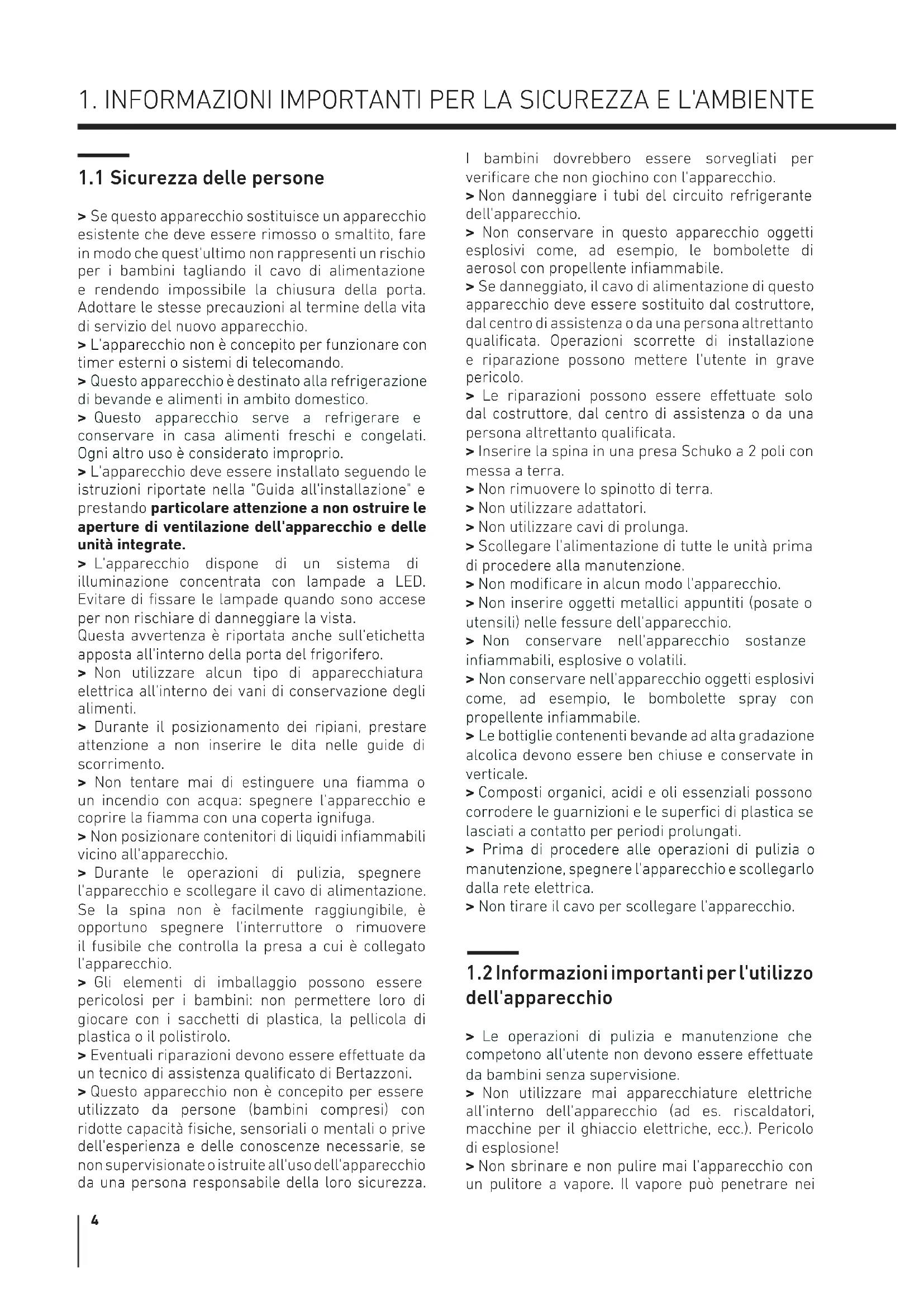 > Se questo apparecchio sostituisce un apparecchio esistente che deve essere rimosso o smaltito, fare in modo che quest'ultimo non rappresenti un rischio per i bambini tagliando il cavo di alimentazione e rendendo impossibile la chiusura della porta. Adottare le stesse precauzioni al termine della vita di servizio del nuovo apparecchio. > L'apparecchio non è concepito per funzionare con timer esterni o sistemi di telecomando. > Questo apparecchio è destinato alla refrigerazione di bevande e alimenti in ambito domestico. > Questo apparecchio serve a refrigerare e conservare in casa alimenti freschi e congelati. Ogni altro uso è considerato improprio. > L'apparecchio deve essere installato seguendo le istruzioni riportate nella "Guida all'installazione" e prestando particolare attenzione a non ostruire le aperture di ventilazione dell'apparecchio e delle unità integrate. > L'apparecchio dispone di un sistema di illuminazione concentrata con lampade a LED. Evitare di fissare le lampade quando sono accese per non rischiare di danneggiare la vista. Questa avvertenza è riportata anche sull'etichetta apposta all'interno della porta del frigorifero. > Non utilizzare alcun tipo di apparecchiatura elettrica all'interno dei vani di conservazione degli alimenti. > Durante il posizionamento dei ripiani, prestare attenzione a non inserire le dita nelle guide di scorrimento. > Non tentare mai di estinguere una fiamma o un incendio con acqua: spegnere l'apparecchio e coprire la fiamma con una coperta ignifuga. > Non posizionare contenitori di liquidi infiammabili vicino all'apparecchio. > Durante le operazioni di pulizia, spegnere l'apparecchio e scollegare il cavo di alimentazione. Se la spina non è facilmente raggiungibile, è opportuno spegnere l'interruttore o rimuovere il fusibile che controlla la presa a cui è collegato l'apparecchio. > Gli elementi di imballaggio possono essere pericolosi per i bambini: non permettere loro di giocare con i sacchetti di plastica, la pellicola di plastica o il polistirolo. > Eventuali riparazioni devono essere eettuate da un tecnico di assistenza qualificato di Bertazzoni. > Questo apparecchio non è concepito per essere utilizzato da persone (bambini compresi) con ridotte capacità fisiche, sensoriali o mentali o prive dell'esperienza e delle conoscenze necessarie, se non supervisionate o istruite all'uso dell'apparecchio da una persona responsabile della loro sicurezza. I bambini dovrebbero essere sorvegliati per verificare che non giochino con l'apparecchio. > Non danneggiare i tubi del circuito refrigerante dell'apparecchio. > Non conservare in questo apparecchio oggetti esplosivi come, ad esempio, le bombolette di aerosol con propellente infiammabile. > Se danneggiato, il cavo di alimentazione di questo apparecchio deve essere sostituito dal costruttore, dal centro di assistenza o da una persona altrettanto qualificata. Operazioni scorrette di installazione e riparazione possono mettere l'utente in grave pericolo. > Le riparazioni possono essere eettuate solo dal costruttore, dal centro di assistenza o da una persona altrettanto qualificata. > Inserire la spina in una presa Schuko a 2 poli con messa a terra. > Non rimuovere lo spinotto di terra. > Non utilizzare adattatori. > Non utilizzare cavi di prolunga. > Scollegare l'alimentazione di tutte le unità prima di procedere alla manutenzione. > Non modificare in alcun modo l'apparecchio. > Non inserire oggetti metallici appuntiti (posate o utensili) nelle fessure dell'apparecchio. > Non conservare nell'apparecchio sostanze infiammabili, esplosive o volatili. > Non conservare nell'apparecchio oggetti esplosivi come, ad esempio, le bombolette spray con propellente infiammabile. > Le bottiglie contenenti bevande ad alta gradazione alcolica devono essere ben chiuse e conservate in verticale. > Composti organici, acidi e oli essenziali possono corrodere le guarnizioni e le superfici di plastica se lasciati a contatto per periodi prolungati. > Prima di procedere alle operazioni di pulizia o manutenzione, spegnere l'apparecchio e scollegarlo dalla rete elettrica. > Non tirare il cavo per scollegare l'apparecchio.
