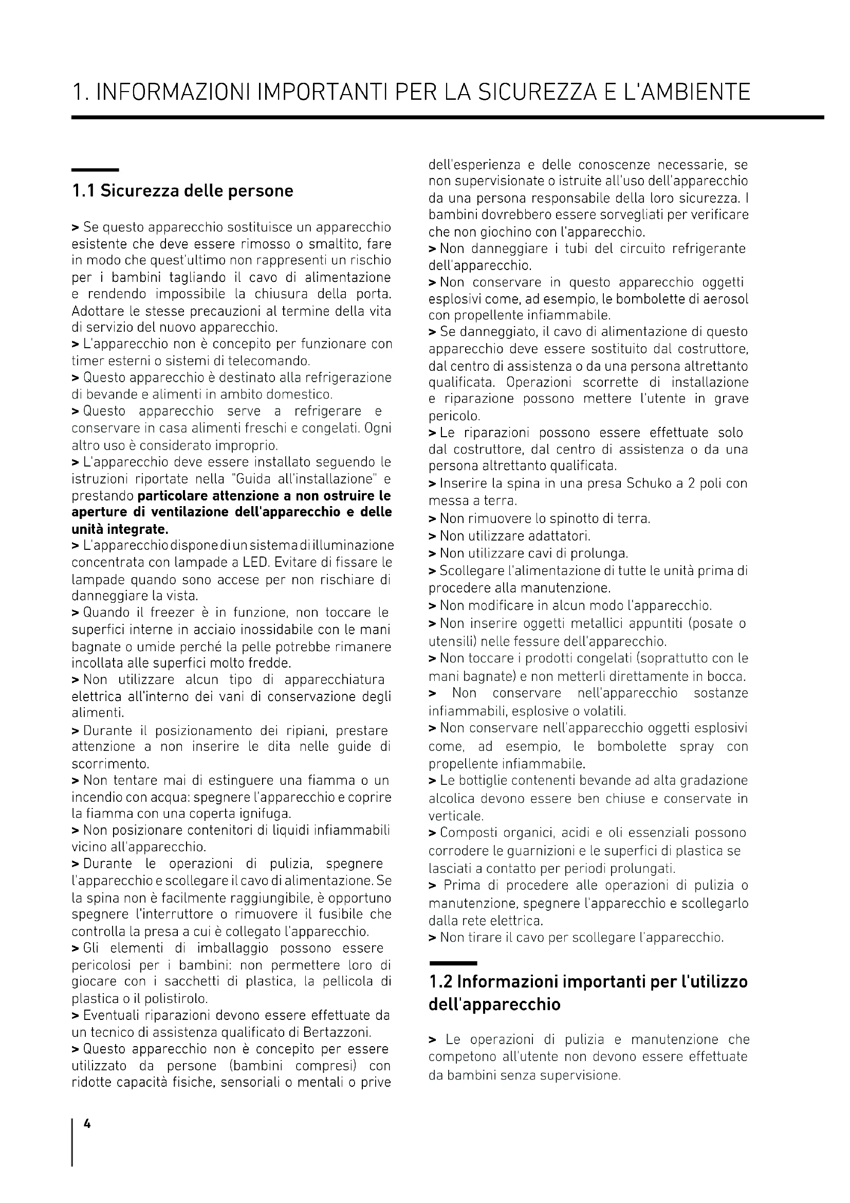 > Se questo apparecchio sostituisce un apparecchio esistente che deve essere rimosso o smaltito, fare in modo che quest'ultimo non rappresenti un rischio per i bambini tagliando il cavo di alimentazione e rendendo impossibile la chiusura della porta. Adottare le stesse precauzioni al termine della vita di servizio del nuovo apparecchio. > L'apparecchio non è concepito per funzionare con timer esterni o sistemi di telecomando. > Questo apparecchio è destinato alla refrigerazione di bevande e alimenti in ambito domestico. > Questo apparecchio serve a refrigerare e conservare in casa alimenti freschi e congelati. Ogni altro uso è considerato improprio. > L'apparecchio deve essere installato seguendo le istruzioni riportate nella "Guida all'installazione" e prestando particolare attenzione a non ostruire le aperture di ventilazione dell'apparecchio e delle unità integrate. > L'apparecchio dispone di un sistema di illuminazione concentrata con lampade a LED. Evitare di fissare le lampade quando sono accese per non rischiare di danneggiare la vista. > Quando il freezer è in funzione, non toccare le superfici interne in acciaio inossidabile con le mani bagnate o umide perché la pelle potrebbe rimanere incollata alle superfici molto fredde. > Non utilizzare alcun tipo di apparecchiatura elettrica all'interno dei vani di conservazione degli alimenti. > Durante il posizionamento dei ripiani, prestare attenzione a non inserire le dita nelle guide di scorrimento. > Non tentare mai di estinguere una fiamma o un incendio con acqua: spegnere l'apparecchio e coprire la fiamma con una coperta ignifuga. > Non posizionare contenitori di liquidi infiammabili vicino all'apparecchio. > Durante le operazioni di pulizia, spegnere l'apparecchio e scollegare il cavo di alimentazione. Se la spina non è facilmente raggiungibile, è opportuno spegnere l'interruttore o rimuovere il fusibile che controlla la presa a cui è collegato l'apparecchio. > Gli elementi di imballaggio possono essere pericolosi per i bambini: non permettere loro di giocare con i sacchetti di plastica, la pellicola di plastica o il polistirolo. > Eventuali riparazioni devono essere eettuate da un tecnico di assistenza qualificato di Bertazzoni. > Questo apparecchio non è concepito per essere utilizzato da persone (bambini compresi) con ridotte capacità fisiche, sensoriali o mentali o prive dell'esperienza e delle conoscenze necessarie, se non supervisionate o istruite all'uso dell'apparecchio da una persona responsabile della loro sicurezza. I bambini dovrebbero essere sorvegliati per verificare che non giochino con l'apparecchio. > Non danneggiare i tubi del circuito refrigerante dell'apparecchio. > Non conservare in questo apparecchio oggetti esplosivi come, ad esempio, le bombolette di aerosol con propellente infiammabile. > Se danneggiato, il cavo di alimentazione di questo apparecchio deve essere sostituito dal costruttore, dal centro di assistenza o da una persona altrettanto qualificata. Operazioni scorrette di installazione e riparazione possono mettere l'utente in grave pericolo. > Le riparazioni possono essere eettuate solo dal costruttore, dal centro di assistenza o da una persona altrettanto qualificata. > Inserire la spina in una presa Schuko a 2 poli con messa a terra. > Non rimuovere lo spinotto di terra. > Non utilizzare adattatori. > Non utilizzare cavi di prolunga. > Scollegare l'alimentazione di tutte le unità prima di procedere alla manutenzione. > Non modificare in alcun modo l'apparecchio. > Non inserire oggetti metallici appuntiti (posate o utensili) nelle fessure dell'apparecchio. > Non toccare i prodotti congelati (soprattutto con le mani bagnate) e non metterli direttamente in bocca. > Non conservare nell'apparecchio sostanze infiammabili, esplosive o volatili. > Non conservare nell'apparecchio oggetti esplosivi come, ad esempio, le bombolette spray con propellente infiammabile. > Le bottiglie contenenti bevande ad alta gradazione alcolica devono essere ben chiuse e conservate in verticale. > Composti organici, acidi e oli essenziali possono corrodere le guarnizioni e le superfici di plastica se lasciati a contatto per periodi prolungati. > Prima di procedere alle operazioni di pulizia o manutenzione, spegnere l'apparecchio e scollegarlo dalla rete elettrica. > Non tirare il cavo per scollegare l'apparecchio.