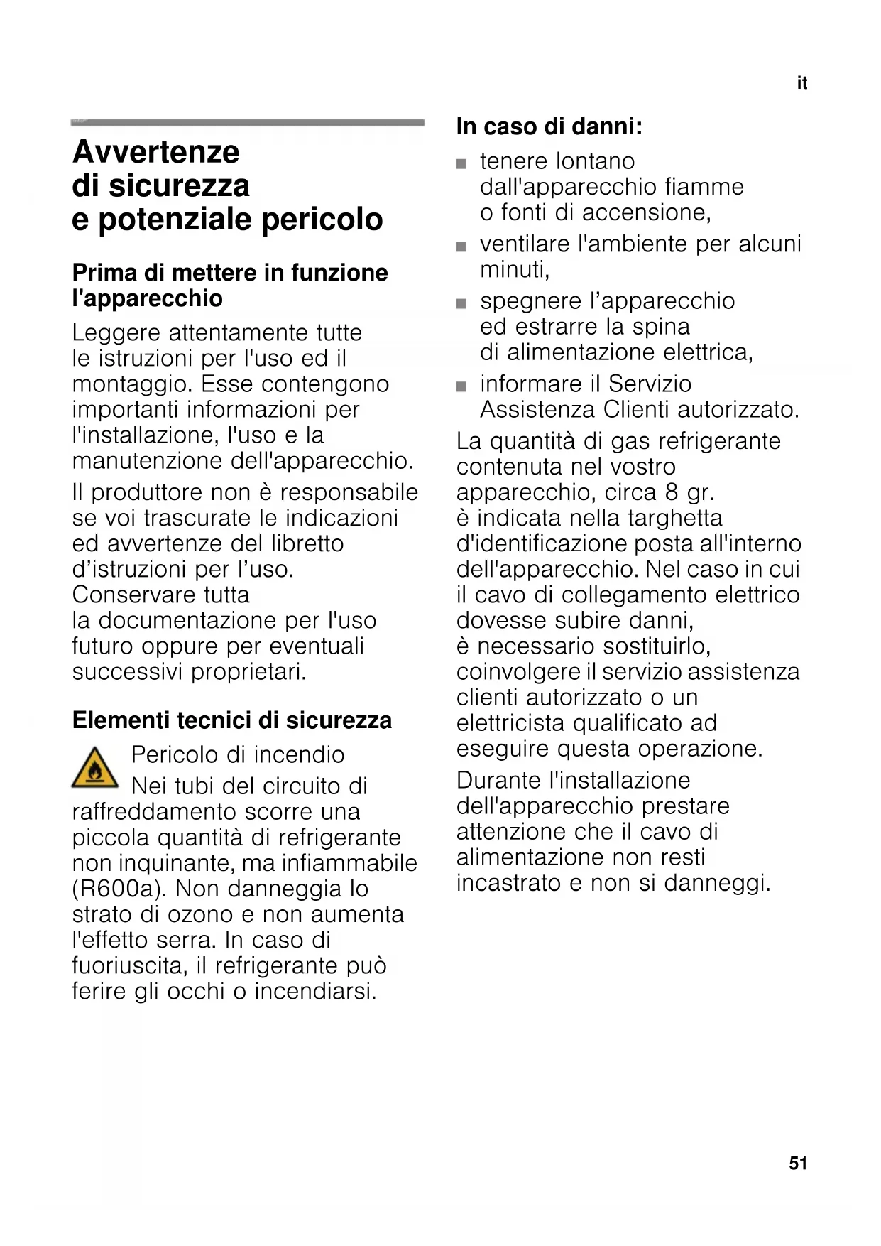 itIndice itIstruzioni per I´uso Avvertenze di sicurezza e potenziale pericolo Prima di mettere in funzione l'apparecchio Leggere attentamente tutte le istruzioni per l'uso ed il montaggio. Esse contengono importanti informazioni per l'installazione, l'uso e la manutenzione dell'apparecchio. Il produttore non è responsabile se voi trascurate le indicazioni ed avvertenze del libretto d’istruzioni per l’uso. Conservare tutta la documentazione per l'uso futuro oppure per eventuali successivi proprietari. Elementi tecnici di sicurezza Pericolo di incendio Nei tubi del circuito di raffreddamento scorre una piccola quantità di refrigerante non inquinante, ma infiammabile (R600a). Non danneggia lo strato di ozono e non aumenta l'effetto serra. In caso di fuoriuscita, il refrigerante può ferire gli occhi o incendiarsi. In caso di danni: ■ tenere lontano dall'apparecchio fiamme o fonti di accensione, ■ ventilare l'ambiente per alcuni minuti, ■ spegnere l’apparecchio ed estrarre la spina di alimentazione elettrica, ■ informare il Servizio Assistenza Clienti autorizzato. La quantità di gas refrigerante contenuta nel vostro apparecchio, circa 8 gr. è indicata nella targhetta d'identificazione posta all'interno dell'apparecchio. Nel caso in cui il cavo di collegamento elettrico dovesse subire danni, è necessario sostituirlo, coinvolgere il servizio assistenza clienti autorizzato o un elettricista qualificato ad eseguire questa operazione. Durante l'installazione dell'apparecchio prestare attenzione che il cavo di alimentazione non resti incastrato e non si danneggi.it