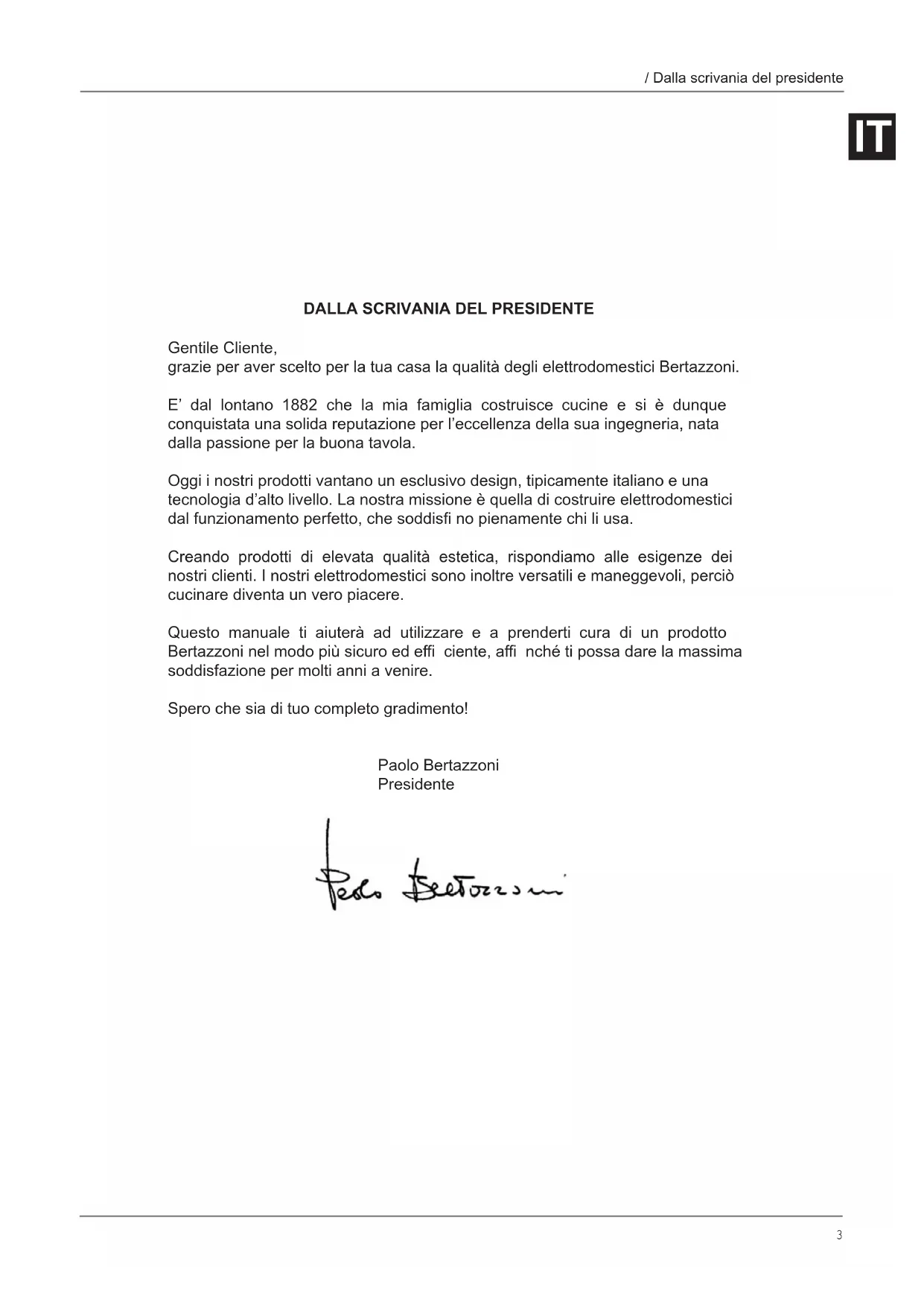 Gentile Cliente, grazie per aver scelto per la tua casa la qualità degli elettrodomestici Bertazzoni. E’ dal lontano 1882 che la mia famiglia costruisce cucine e si è dunque conquistata una solida reputazione per l’eccellenza della sua ingegneria, nata dalla passione per la buona tavola. Oggi i nostri prodotti vantano un esclusivo design, tipicamente italiano e una tecnologia d’alto livello. La nostra missione è quella di costruire elettrodomestici dal funzionamento perfetto, che soddisfi no pienamente chi li usa. Creando prodotti di elevata qualità estetica, rispondiamo alle esigenze dei nostri clienti. I nostri elettrodomestici sono inoltre versatili e maneggevoli, perciò cucinare diventa un vero piacere. Questo manuale ti aiuterà ad utilizzare e a prenderti cura di un prodotto Bertazzoni nel modo più sicuro ed effi ciente, affi nché ti possa dare la massima soddisfazione per molti anni a venire. Spero che sia di tuo completo gradimento! Paolo Bertazzoni Presidente4