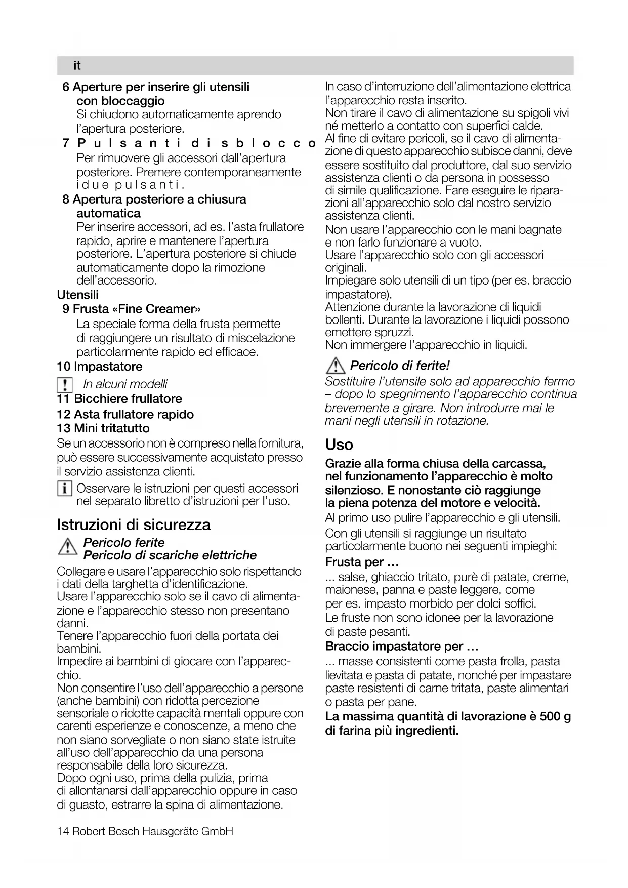 Sous réserve de modifications. `çåÖê~íìä~òáçåá=éÉê=äÛ~Åèìáëíç=Çá=èìÉëíç= åìçîç=~éé~êÉÅÅÜáç=Çá=éêçÇìòáçåÉ =_lp`eK `çå=Éëëç=~îÉíÉ=ëÅÉäíç=ìå=Éä ÉííêçÇçãÉëíáÅç= ãçÇÉêåç=É=Çá=Öê~å=éêÉÖáçK=qêçî~íÉ=ìäíÉêáçêá= áåÑçêã~òáçåá=ëìá=åçëíêá=éêçÇçííá=åÉä=åçëíêç= ëáíç=fåíÉêåÉíK it14 Robert Bosch Hausgeräte GmbH 6 Aperture per inserire gli utensili con bloccaggio Si chiudono automaticamente aprendo l’apertura posteriore. 7Pulsanti di sblocco Per rimuovere gli accessori dall’apertura posteriore. Premere contemporaneamente idue pulsanti. 8 Apertura posteriore a chiusura automatica Per inserire accessori, ad es. l’asta frullatore rapido, aprire e mantenere l’apertura posteriore. L’apertura posteriore si chiude automaticamente dopo la rimozione dell’accessorio. Utensili 9 Frusta «Fine Creamer» La speciale forma della frusta permette di raggiungere un risultato di miscelazione particolarmente rapido ed efficace. 10 Impastatore få=~äÅìåá =ãç ÇÉää á 11 Bicchiere frullatore 12 Asta frullatore rapido 13 Mini tritatutto Se un accessorio non è compreso nella fornitura, può essere successivamente acquistato presso il servizio assistenza clienti. Osservare le istruzioni per questi accessori nel separato libretto d’istruzioni per l’uso. Istruzioni di sicurezza mÉêáÅçäç=ÑÉêáíÉ mÉêáÅçäç=Çá=ëÅ~êáÅÜÉ=ÉäÉííêáÅÜÉ Collegare e usare l’apparecchio solo rispettando i dati della targhetta d’identificazione. Usare l’apparecchio solo se il cavo di alimenta- zione e l’apparecchio stesso non presentano danni. Tenere l’apparecchio fuori della portata dei bambini. Impedire ai bambini di giocare con l’apparec- chio. Non consentire l’uso dell’apparecchio a persone (anche bambini) con ridotta percezione sensoriale o ridotte capacità mentali oppure con carenti esperienze e conoscenze, a meno che non siano sorvegliate o non siano state istruite all’uso dell’apparecchio da una persona responsabile della loro sicurezza. Dopo ogni uso, prima della pulizia, prima di allontanarsi dall’apparecchio oppure in caso di guasto, estrarre la spina di alimentazione. In caso d’interruzione dell’alimentazione elettrica l’apparecchio resta inserito. Non tirare il cavo di alimentazione su spigoli vivi né metterlo a contatto con superfici calde. Al fine di evitare pericoli, se il cavo di alimenta- zione di questo apparecchio subisce danni, deve essere sostituito dal produttore, dal suo servizio assistenza clienti o da persona in possesso di simile qualificazione. Fare eseguire le ripara- zioni all’apparecchio solo dal nostro servizio assistenza clienti. Non usare l’apparecchio con le mani bagnate e non farlo funzionare a vuoto. Usare l’apparecchio solo con gli accessori originali. Impiegare solo utensili di un tipo (per es. braccio impastatore). Attenzione durante la lavorazione di liquidi bollenti. Durante la lavorazione i liquidi possono emettere spruzzi. Non immergere l’apparecchio in liquidi. mÉêáÅçäç=Çá=ÑÉêáíÉ> pçëíáíìáêÉ=äÛìíÉåëáäÉ=ëçäç=~Ç=~éé~êÉÅÅÜáç=ÑÉêãç= Ó=Ççéç=äç=ëéÉÖåáãÉåíç=äÛ~éé~êÉÅÅÜáç=Åçåíáåì~= ÄêÉîÉãÉåíÉ=~=Öáê~êÉK=kçå=áåíêçÇìêêÉ=ã~á=äÉ= ã~åá=åÉÖäá=ìíÉåëáäá=áå=êçí~òáçåÉK Uso Grazie alla forma chiusa della carcassa, nel funzionamento l’apparecchio è molto silenzioso. E nonostante ciò raggiunge la piena potenza del motore e velocità. Al primo uso pulire l’apparecchio e gli utensili. Con gli utensili si raggiunge un risultato particolarmente buono nei seguenti impieghi: Frusta per … ... salse, ghiaccio tritato, purè di patate, creme, maionese, panna e paste leggere, come per es. impasto morbido per dolci soffici. Le fruste non sono idonee per la lavorazione di paste pesanti. Braccio impastatore per … ... masse consistenti come pasta frolla, pasta lievitata e pasta di patate, nonché per impastare paste resistenti di carne tritata, paste alimentari o pasta per pane. La massima quantità di lavorazione è 500 g di farina più ingredienti. itRobert Bosch Hausgeräte GmbH 15 Figura Svolgere completamente il cavo di alimenta- zione. Applicare l’utensile desiderato sull’apparec- chio base e spingerlo fino all’arresto. Per evitare confusioni, prestare atten- zione alla forma degli elementi di plastica degli utensili (vedi figura -1). Inserire la spina di alimentazione. Introdurre l’alimento in un idoneo contenitore. Introdurre gli utensili nel contenitore ed accendere l’apparecchio alla velocità desiderata. Grado 1, 2: per incorporare e mescolare. Grado 3, 4, 5: per impastare e montare. Dopo il lavoro disporre il selettore suo 0/Off e staccare gli utensili con il pulsante di espulsione e rimuoverli. ^ííÉåòáçåÉW fä=éìäë~åíÉ=Çá=ÉëéìäëáçåÉ=åçå=éì∂=ÉëëÉêÉ= ~òáçå~íç=ëÉ=áä=ëÉäÉííçêÉ=åçå=≠=Çáëéçë íç=ëì =MLlÑ ÑK ^îîÉêíÉåò~W péÉÖåÉêÉ=ëÉãéê É=äÛ ~éé~êÉ ÅÅÜáç= Ä~ëÉI= éêáã~= Çá Éëíê~êäç=Ç~ääÛ~äáãÉåíç=ãáëÅÉä~íçK Dopo il lavoro/Pulizia mÉêáÅçäç=Çá=ëÅ~êáÅ~=ÉäÉííêáÅ~= ÉÇÛáåÅÉåÇáç> kçå=áããÉêÖÉêÉ=ã~á=äÛ~éé~êÉÅÅÜáç=Ä~ëÉ= áå ~Åèì~I=å¨=ä~î~êä ç=áå=ä~î~ëíçîáÖäáÉK kçå=éìäáêÉ=Å çå=~éé~ êÉÅÅÜ á=~= î~éçêÉK ^ííÉåòáçåÉ> mçëëáÄáäá=Ç~åå á=~ääÉ=ë ìéÉêÑ áÅáK= kçå ìíáäáòò~êÉ ÇÉíÉêÖÉåíá=~Äê~ëáîáK Estrarre la spina di alimentazione. Pulire il blocco motore con un panno umido ed infine asciugarlo. Lavare gli utensili nella lavastoviglie o con una spazzola sotto acqua corrente. Avvertenza: nella lavorazione per es. di cavolo rosso, sulle