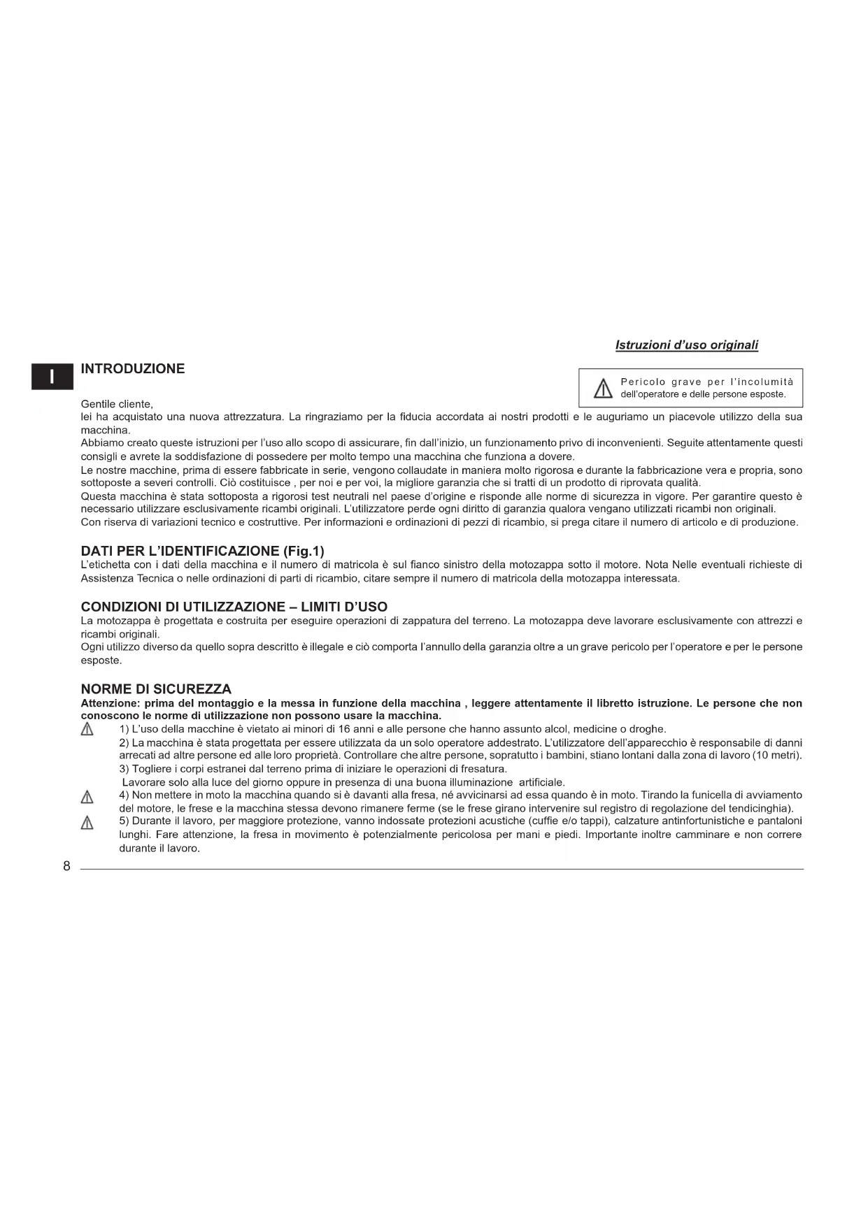 INTRODUZIONE Gentile cliente, lei ha acquistato una nuova attrezzatura. La ringraziamo per la ducia accordata ai nostri prodotti e le auguriamo un piacevole utilizzo della sua macchina. Abbiamo creato queste istruzioni per l’uso allo scopo di assicurare, n dall’inizio, un funzionamento privo di inconvenienti. Seguite attentamente questi consigli e avrete la soddisfazione di possedere per molto tempo una macchina che funziona a dovere. Le nostre macchine, prima di essere fabbricate in serie, vengono collaudate in maniera molto rigorosa e durante la fabbricazione vera e propria, sono sottoposte a severi controlli. Ciò costituisce , per noi e per voi, la migliore garanzia che si tratti di un prodotto di riprovata qualità. Questa macchina è stata sottoposta a rigorosi test neutrali nel paese d’origine e risponde alle norme di sicurezza in vigore. Per garantire questo è necessario utilizzare esclusivamente ricambi originali. L’utilizzatore perde ogni diritto di garanzia qualora vengano utilizzati ricambi non originali. Con riserva di variazioni tecnico e costruttive. Per informazioni e ordinazioni di pezzi di ricambio, si prega citare il numero di articolo e di produzione. DATI PER L’IDENTIFICAZIONE (Fig.1) L’etichetta con i dati della macchina e il numero di matricola è sul anco sinistro della motozappa sotto il motore. Nota Nelle eventuali richieste di Assistenza Tecnica o nelle ordinazioni di parti di ricambio, citare sempre il numero di matricola della motozappa interessata.