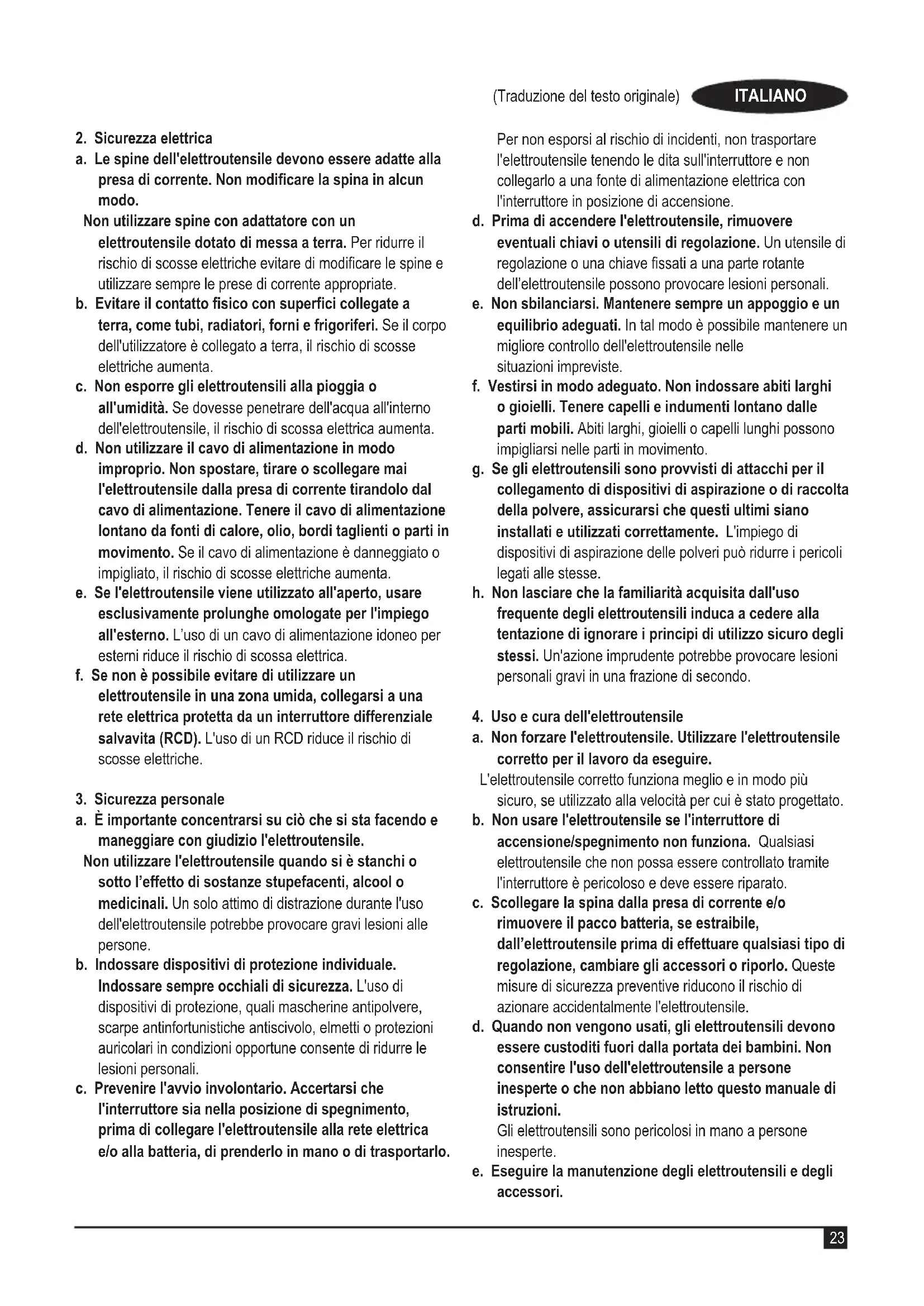 Avvertenza! Leggere attentamente tutte le avvertenze, istruzioni, illustrazioni e speciche fornite con l'elettroutensile. La mancata osservanza delle avvertenze e delle istruzioni seguenti può dar luogo a scosse elettriche, incendio e/o lesioni personali gravi.Conservare tutte le avvertenze e le istruzioni per riferimenti futuri. Il termine "elettroutensile" utilizzato in tutte le avvertenze elencate di seguito fa riferimento sia agli utensili alimentati tramite una rete elettrica (con cavo) che agli utensili elettrici a batteria (senza cavo).1. Sicurezza dell'area di lavoroa. Mantenere pulita e bene illuminata l'area di lavoro. Gli ambienti disordinati o scarsamente illuminati favoriscono gli incidenti.b. Evitare di usare gli elettroutensili in ambienti esposti a rischio di esplosione, ad esempio in presenza di liquidi, gas o polveri inammabili. Gli elettroutensili generano scintille che potrebbero incendiare polveri o fumi.c. Durante l’uso di un elettroutensile, tenere lontani i bambini e le altre persone presenti. Eventuali distrazioni possono provocare la perdita di controllo.23 (Traduzione del testo originale) ITALIANO