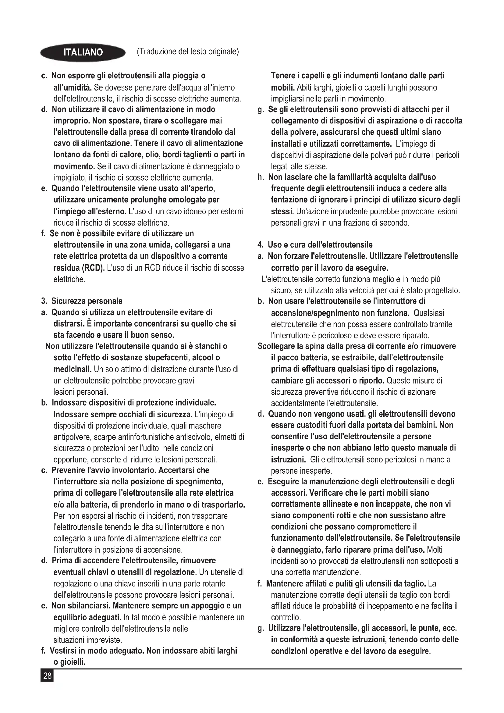 a. Le spine dell'elettroutensile devono essere adatte alla presa di corrente. Non modicare la spina in alcun modo. Non utilizzare spine con adattatore con un elettroutensile dotato di messa a terra. Per ridurre il rischio di scosse elettriche evitare di modicare le spine e utilizzare sempre le prese di corrente appropriate. b. Evitare il contatto sico con superci collegate a terra, come tubi, radiatori, forni e frigoriferi. Se il corpo dell'utilizzatore è collegato a terra, il rischio di scosse elettriche aumenta.28 (Traduzione del testo originale) ITALIANO c. Non esporre gli elettroutensili alla pioggia o all'umidità. Se dovesse penetrare dell'acqua all'interno dell'elettroutensile, il rischio di scosse elettriche aumenta. d. Non utilizzare il cavo di alimentazione in modo improprio. Non spostare, tirare o scollegare mai l'elettroutensile dalla presa di corrente tirandolo dal cavo di alimentazione. Tenere il cavo di alimentazione lontano da fonti di calore, olio, bordi taglienti o parti in movimento. Se il cavo di alimentazione è danneggiato o impigliato, il rischio di scosse elettriche aumenta. e. Quando l'elettroutensile viene usato all'aperto, utilizzare unicamente prolunghe omologate per l'impiego all'esterno. L'uso di un cavo idoneo per esterni riduce il rischio di scosse elettriche. f. Se non è possibile evitare di utilizzare un elettroutensile in una zona umida, collegarsi a una rete elettrica protetta da un dispositivo a corrente residua (RCD). L'uso di un RCD riduce il rischio di scosse elettriche.