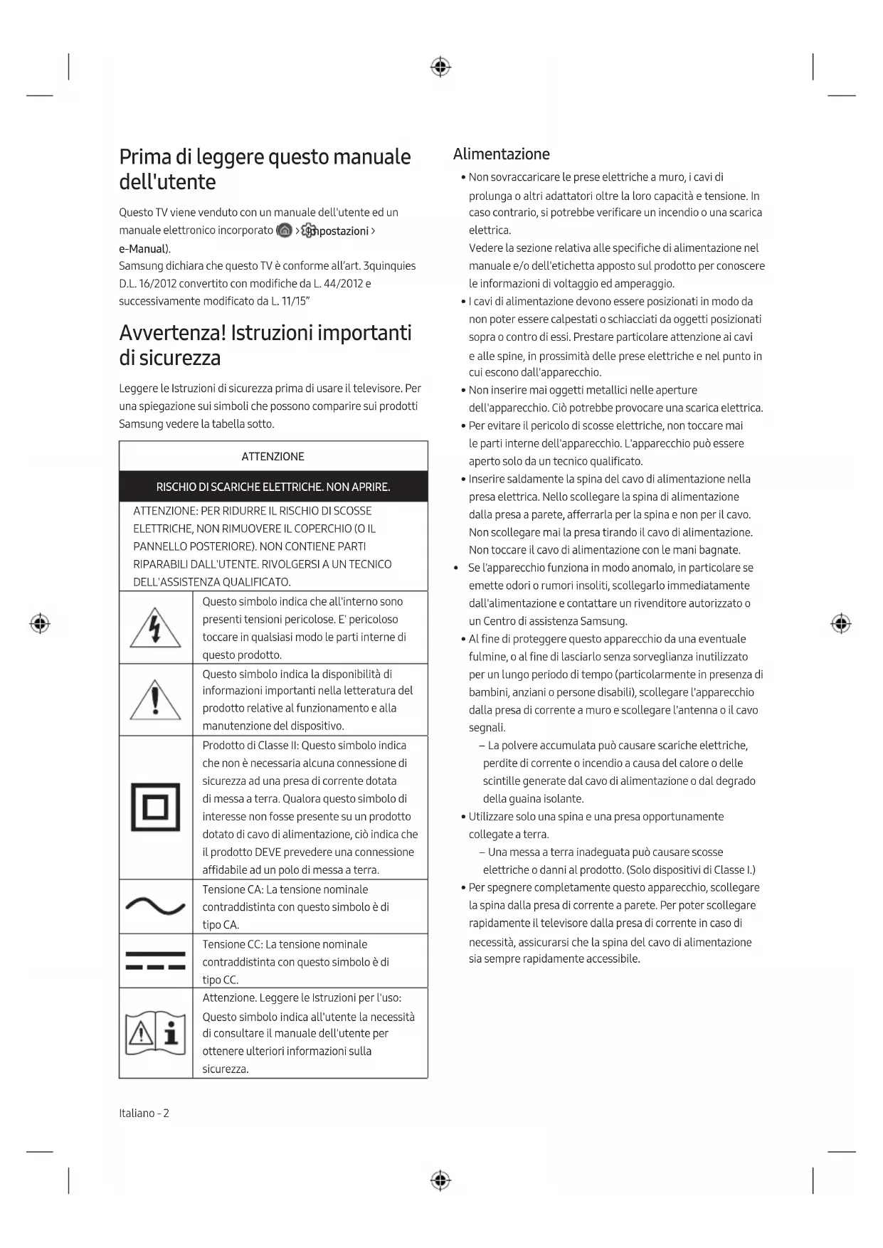 - Le figure e le illustrazioni presenti in questo Manuale dell'utente sono fornite unicamente a titolo di riferimento e possono differire da quelle del prodotto attuale. Le specifiche e il design del prodotto possono variare senza preavviso. Samsung non potrà essere ritenuta responsabile per danni a cose e persone o per problematiche legate alla sicurezza dovute a riparazioni non effettuate da Samsung o da un fornitore di servizi autorizzato da Samsung in accordo con le linee guida dell'azienda relative alla riparazione ed alla manutenzione dei propri prodotti. Qualsiasi danno causato al prodotto da personale non autorizzato durante un tentativo di riparazione non potrà essere coperto dalla garanzia convenzionale. Si prega gentilmente di visitare il sito samsung.com/support per ulteriori informazioni sull'adattatore di alimentazione esterno e sul telecomando associati alla direttiva UE sulla progettazione ecocompatibile - Regolamento ErP Italiano - 8Corretto smaltimento del prodotto (rifiuti elettrici ed elettronici) (Applicabile nei Paesi con sistemi di raccolta differenziata) Il simbolo (un contenitore della spazzatura su ruote barrato accompagnato da una barra piena orizzontale) riportato sul prodotto, sull'imballaggio, sulle istruzioni per l'uso e sulla garanzia, anche se in formato digitale, indica che il prodotto e i relativi accessori elettrici ed elettronici non devono essere smaltiti come rifiuti urbani misti al termine del ciclo di vita ma devono essere raccolti separatamente in modo da permetterne il riutilizzo, il riciclaggio e altre forme di recupero in conformità alla normativa vigente. I rifiuti derivanti da apparecchiature elettriche ed elettroniche possono, infatti, contenere sostanze dannose e pericolose che, se non correttamente gestite, costituiscono un pericolo per l’ambiente e la salute umana. L’utente ha, quindi, un ruolo attivo nel ciclo di recupero e riciclaggio dei rifiuti di apparecchiature elettriche ed elettroniche. Al fine di evitare eventuali danni all'ambiente o alla salute causati da uno smaltimento non corretto, si invita pertanto l'utente a separare il prodotto e i suddetti accessori da altri tipi di rifiuti, conferendoli ai sistemi di ritiro e di raccolta autorizzati secondo le normative locali. Gli utenti domestici possono consegnare gratuitamente l’apparecchiatura che desiderano smaltire al distributore, al momento dell’acquisto di una nuova apparecchiatura di tipo equivalente. Presso i distributori di apparecchiature elettriche ed elettroniche con superficie di vendita di almeno 400 m2 è inoltre possibile consegnare gratuitamente, senza obbligo di acquisto, i prodotti elettrici ed elettronici da smaltire con dimensioni esterne inferiori a 25 cm. Gli utenti professionali (imprese e professionisti) sono invitati a contattare il proprio fornitore e verificare i termini e le condizioni del contratto di acquisto. Corretto smaltimento delle batterie del prodotto (Applicabile nei Paesi con sistemi di raccolta differenziata) Il simbolo riportato sulla pila, sull’accumulatore o sul pacco batterie o sulla sua documentazione o confezione (un bidone della spazzatura con ruote barrato da una croce) indica che la batteria, l’accumulatore o il pacco batteria non deve essere smaltito insieme al rifiuto urbano indifferenziato ma deve essere raccolto separatamente in modo da permetterne il trattamento, il riciclaggio e lo smaltimento in conformità alla normativa vigente, evitando in questo modo potenziali danni alla salute umana e all’ambiente. L’utilizzatore ha, quindi, un ruolo attivo nel riciclaggio di pile e accumulatori, potendo disfarsi dei relativi rifiuti nel più vicino punto di raccolta – organizzato e gestito in conformità alla normativa vigente – senza oneri e senza l’obbligo di acquistare nuove pile o nuovi accumulatori. L’eventuale presenza, sotto il simbolo del bidone della spazzatura con ruote barrato da una croce, del simbolo chimico Hg, Cd o Pb indica che la pila o l’accumulatore contiene più di 0,0005 per cento di mercurio (simbolo chimico Hg), più di 0,002 per cento di cadmio (simbolo chimico Cd) o più di 0,004 per cento di piombo (simbolo chimico Pb). Italiano - 9 ItalianoPirms šīs lietotāja rokasgrāmatas lasīšanas Televizora komplektācijā ir iekļauta šī lietotāja rokasgrāmata un televizorā iegultā e-Manual pamācība ( > Iestatījumi > e-Manual). Brīdinājums! Svarīgas drošības instrukcijas Lūdzu, izlasiet šīs drošības instrukcijas pirms televizora izmantošanas. Tālāk esošajā tabulā skatiet to simbolu skaidrojumu, kas var būt norādīti uz jūsu Samsung produkta. UZMANĪBU ELEKTROŠOKA RISKS. NEATVĒRT. UZMANĪBU: LAI IZVAIRĪTOS NO ELEKTROŠOKA RISKA, NENOŅEMIET VĀKU (VAI AIZMUGURI). IEKŠPUSĒ NAV DAĻU, KURU APKOPI VAR VEIKT LIETOTĀJS. UZTICIET