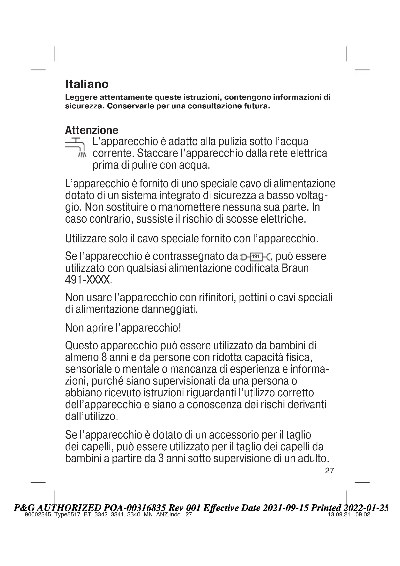 , può essere utilizzato con qualsiasi alimentazione codificata Braun 491-XXXX. Non usare l’apparecchio con rifinitori, pettini o cavi speciali di alimentazione danneggiati. Non aprire l’apparecchio! Questo apparecchio può essere utilizzato da bambini di almeno 8 anni e da persone con ridotta capacità fisica, sensoriale o mentale o mancanza di esperienza e informa- zioni, purché siano supervisionati da una persona o abbiano ricevuto istruzioni riguardanti l’utilizzo corretto dell’apparecchio e siano a conoscenza dei rischi derivanti dall’utilizzo. Se l’apparecchio è dotato di un accessorio per il taglio dei capelli, può essere utilizzato per il taglio dei capelli da bambini a partire da 3 anni sotto supervisione di un adulto. 90002245_Type5517_BT_3342_3341_3340_MN_ANZ.indd 2790002245_Type5517_BT_3342_3341_3340_MN_ANZ.indd 27 13.09.21 09:0213.09.21 09:02 Business Use - P&G AUTHORIZED POA-00316835 Rev 001 Effective Date 2021-09-15 Printed 2022-01-25 Page 27 of 5228 I bambini non devono giocare con l’apparecchio. La pulizia e la manutenzione dell’apparecchio non devono essere effettuate da bambini. Descrizione 1a Pettine di precisione da barba (1–10 mm) 1b Pettine di precisione per capelli (11–20 mm)* 2 Testina rifinitore 3 Selettore di lunghezza 4 Interruttore acceso/spento 5 Indicatore di ricarica 6 Presa di corrente 7 Set di cavi speciali (il design può essere diverso in base al modello)