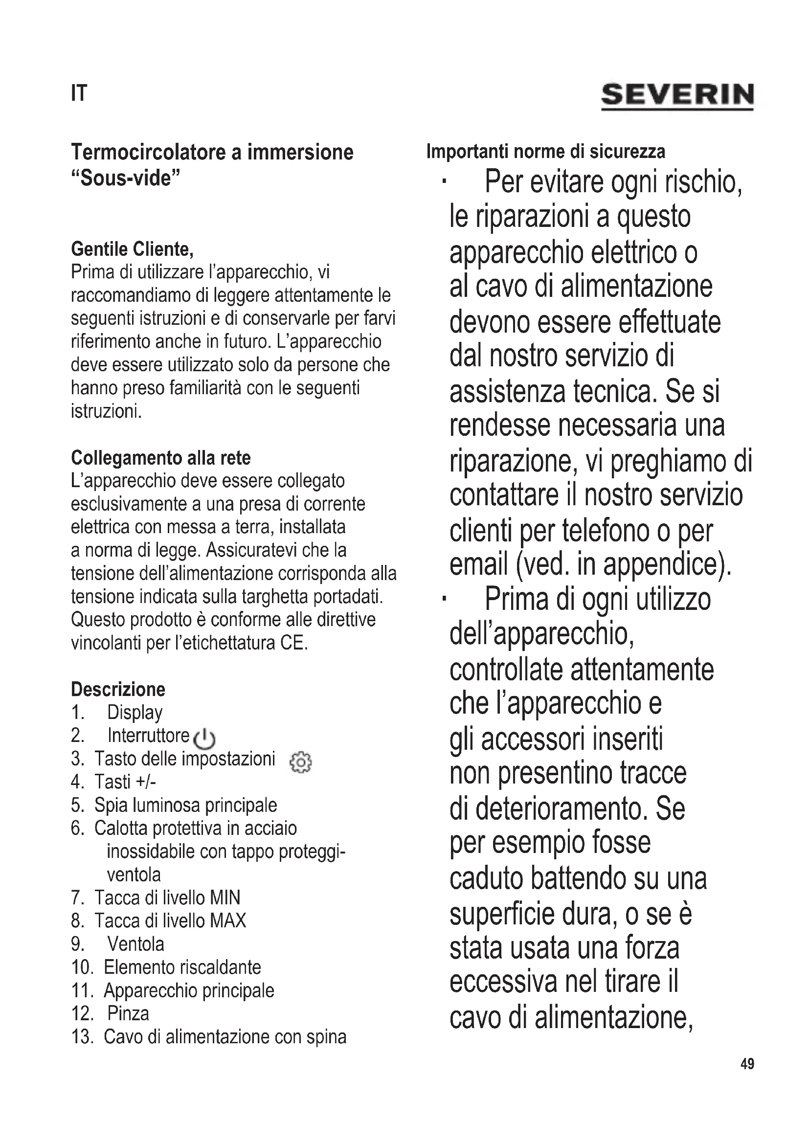 Termocircolatore a immersione “Sous-vide” Gentile Cliente, Prima di utilizzare l’apparecchio, vi raccomandiamo di leggere attentamente le seguenti istruzioni e di conservarle per farvi riferimento anche in futuro. L’apparecchio deve essere utilizzato solo da persone che hanno preso familiarità con le seguenti istruzioni. Collegamento alla rete L’apparecchio deve essere collegato esclusivamente a una presa di corrente elettrica con messa a terra, installata a norma di legge. Assicuratevi che la tensione dell’alimentazione corrisponda alla tensione indicata sulla targhetta portadati. Questo prodotto è conforme alle direttive vincolanti per l’etichettatura CE. Descrizione