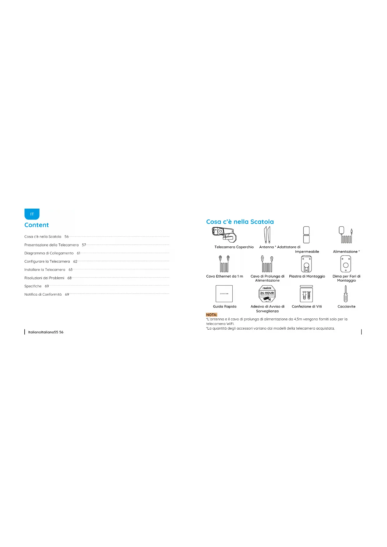 - Consultareilrivenditoreountecnico radio/TVespertoperassistenza. DichiarazionediavvertenzaRFFCC: Ildispositivoèstatovalutatoper soddisfareirequisitigeneralidiesposizione alleradiofrequenze.Ildispositivopuò essereutilizzatoincondizionidiesposizione portatilesenzalimitazioni.Italiano Italiano71 72 Questoprodottovienefornitoconuna garanzialimitatadi2anni,laqualesi applicasoloaiprodottiacquisitisulnegozio ucialeReolinkoirivenditoriautorizzati dallaparteReolink.Ulterioriinformazioni: https://reolink.com/it/warranty-and-return/. Garanzia Limitata NOTA: Speriamo che sia una buona esperienzaaveracquistatoilnostro prodotto.Nelcasononfossisoddisfatto delprodottoacquistatoeavessiintenzione di restituirlo, ti suggeriamo gentilmente di ripristinarelatelecameraalleimpostazioni difabbricapredeniteprimadella restituzione. L’utilizzodelprodottoèsoggetto all’accettazionedeiTerminidiservizioe dell’Informativasullaprivacysu reolink.com.Tenerefuoridallaportatadei bambini. Termini e Privacy Utilizzandoilsoftwareprodottoincorporato alprodottoReolink,voiaccettateitermini diquestoaccordodilicenzaperl’utente finale(“EULA”)fravoieReolink.Scopridi più:https://reolink.com/eula/. LatelecameraWiFièconformeailimiti diesposizionealleradiazioniRSS-102 impostati per un ambiente non controllato. Questaattrezzaturadeveessereinstallata eoperataconunadistanzaminimadi20 cmfral’oggettoradianteeilvostrocorpo. Contratto di Licenza per l’Utente Finale Dichiarazione sulla Esposizione alle Radiazioni ISED (Per la versione WiFi) Questomarchioindicachequesto prodottonondeveessererottamato insiemeadaltririutidomesticiattraverso l’UE.Perprevenirepossibilidanni all’ambienteoallasaluteumanadaun incontrollatoscaricodiriuti,riciclalo responsabilmenteperpromuovereilriuso sostenibiledellematerieprime.Per restituireildispositivousato,perfavore usa il sistema di resi e raccolta o contatta il puntovenditadoveilprodottoèstato 2412MHz---2472MHz(19dBm) 5150MHz---5350MHz(18dBm) 5470MHz---5725MHz(18dBm) FREQUENZA OPERATIVA (Per la versione WiFi) (la potenza massima trasmessa) Corretta Rottamazione di Questo Prodotto ReolinkdichiarachelatelecameraWiFi èinconformitàconirequisitiessenzialie altrerilevantidisposizionidellaDirettiva 2014/53/EU,latelecameraPoEèin conformitàconlaDirettiva2014/30/EU. Dichiarazione Semplicata di Conformità UE acquistato.Possonorilevarequesto prodotto per un riciclo sicuro per l’ambiente.Español Español73 74 Contenido de la Caja 74 IntroduccióndeCámara 75 Diagrama de Conexión 79 CongurelaCámara 80 Monte la Cámara 81 SolucióndeProblemas 86 Especicaciones 87 NoticacióndeCumplimiento 87 Contenido de la Caja Paquete de Tornillos Cámara Tapa Impermeable Plantilla de Montaje Antena * Adaptador de Corriente* Cable de Extensión de Alimentación