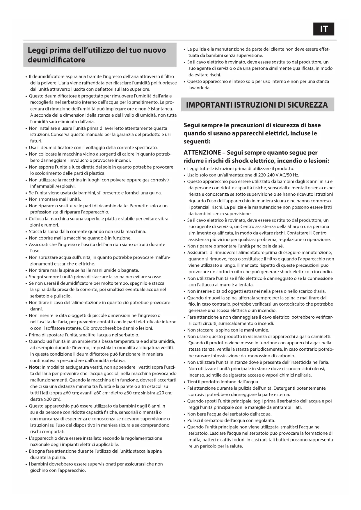 IT: Grazie per aver acquistato quello deumidificatore SHARP. Vi preghiamo di leggere attendamente quello manuale prima di utilizzare il prodotto. Si consiglia di tenerne quello manuale in unippo sicuro, in caso di consulazioni future.