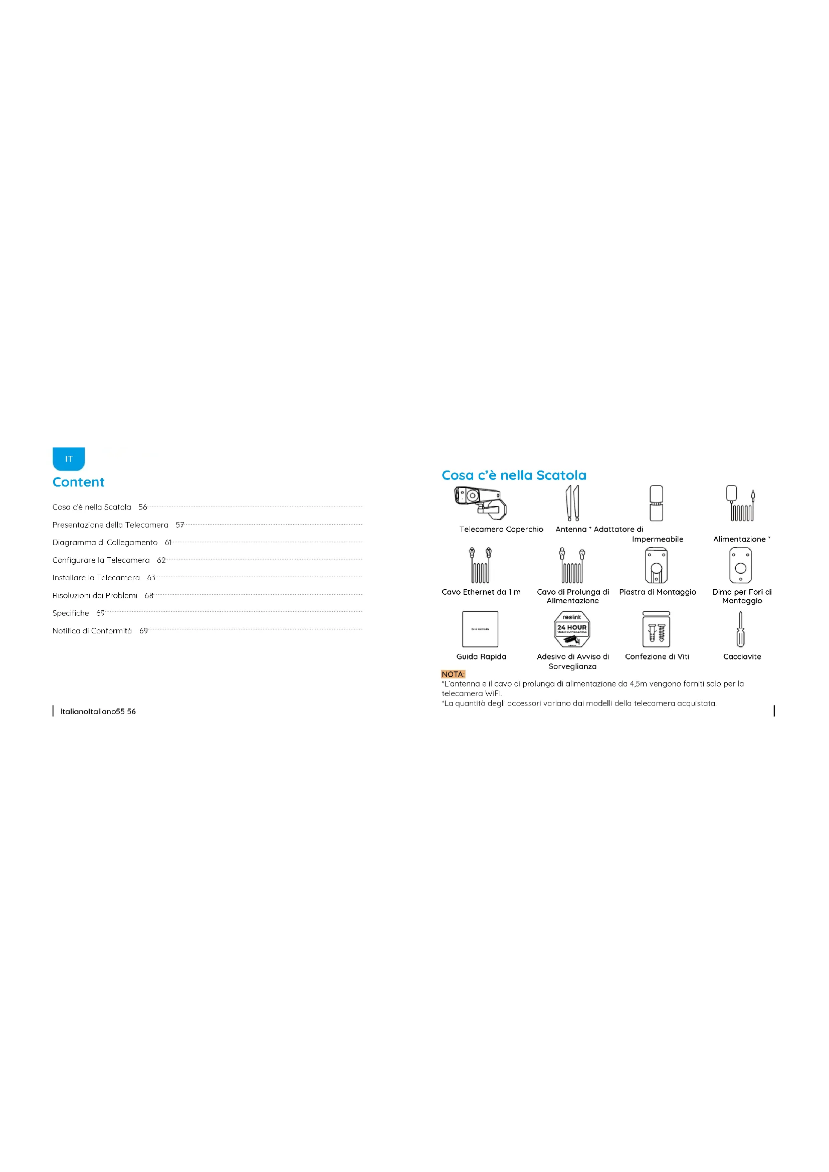 - Consultareilrivenditoreountecnico radio/TVespertoperassistenza. DichiarazionediavvertenzaRFFCC: Ildispositivoèstatovalutatoper soddisfareirequisitigeneralidiesposizione alleradiofrequenze.Ildispositivopuò essereutilizzatoincondizionidiesposizione portatilesenzalimitazioni.Italiano Italiano71 72 Questoprodottovienefornitoconuna garanzialimitatadi2anni,laqualesi applicasoloaiprodottiacquisitisulnegozio ucialeReolinkoirivenditoriautorizzati dallaparteReolink.Ulterioriinformazioni: https://reolink.com/it/warranty-and-return/. Garanzia Limitata NOTA: Speriamo che sia una buona esperienzaaveracquistatoilnostro prodotto.Nelcasononfossisoddisfatto delprodottoacquistatoeavessiintenzione di restituirlo, ti suggeriamo gentilmente di ripristinarelatelecameraalleimpostazioni difabbricapredeniteprimadella restituzione. L’utilizzodelprodottoèsoggetto all’accettazionedeiTerminidiservizioe dell’Informativasullaprivacysu reolink.com.Tenerefuoridallaportatadei bambini. Termini e Privacy Utilizzandoilsoftwareprodottoincorporato alprodottoReolink,voiaccettateitermini diquestoaccordodilicenzaperl’utente finale(“EULA”)fravoieReolink.Scopridi più:https://reolink.com/eula/. LatelecameraWiFièconformeailimiti diesposizionealleradiazioniRSS-102 impostati per un ambiente non controllato. Questaattrezzaturadeveessereinstallata eoperataconunadistanzaminimadi20 cmfral’oggettoradianteeilvostrocorpo. Contratto di Licenza per l’Utente Finale Dichiarazione sulla Esposizione alle Radiazioni ISED (Per la versione WiFi) Questomarchioindicachequesto prodottonondeveessererottamato insiemeadaltririutidomesticiattraverso l’UE.Perprevenirepossibilidanni all’ambienteoallasaluteumanadaun incontrollatoscaricodiriuti,riciclalo responsabilmenteperpromuovereilriuso sostenibiledellematerieprime.Per restituireildispositivousato,perfavore usa il sistema di resi e raccolta o contatta il puntovenditadoveilprodottoèstato 2412MHz---2472MHz(19dBm) 5150MHz---5350MHz(18dBm) 5470MHz---5725MHz(18dBm) FREQUENZA OPERATIVA (Per la versione WiFi) (la potenza massima trasmessa) Corretta Rottamazione di Questo Prodotto ReolinkdichiarachelatelecameraWiFi èinconformitàconirequisitiessenzialie altrerilevantidisposizionidellaDirettiva 2014/53/EU,latelecameraPoEèin conformitàconlaDirettiva2014/30/EU. Dichiarazione Semplicata di Conformità UE acquistato.Possonorilevarequesto prodotto per un riciclo sicuro per l’ambiente.Español Español73 74 Contenido de la Caja 74 IntroduccióndeCámara 75 Diagrama de Conexión 79 CongurelaCámara 80 Monte la Cámara 81 SolucióndeProblemas 86 Especicaciones 87 NoticacióndeCumplimiento 87 Contenido de la Caja Paquete de Tornillos Cámara Tapa Impermeable Plantilla de Montaje Antena * Adaptador de Corriente* Cable de Extensión de Alimentación