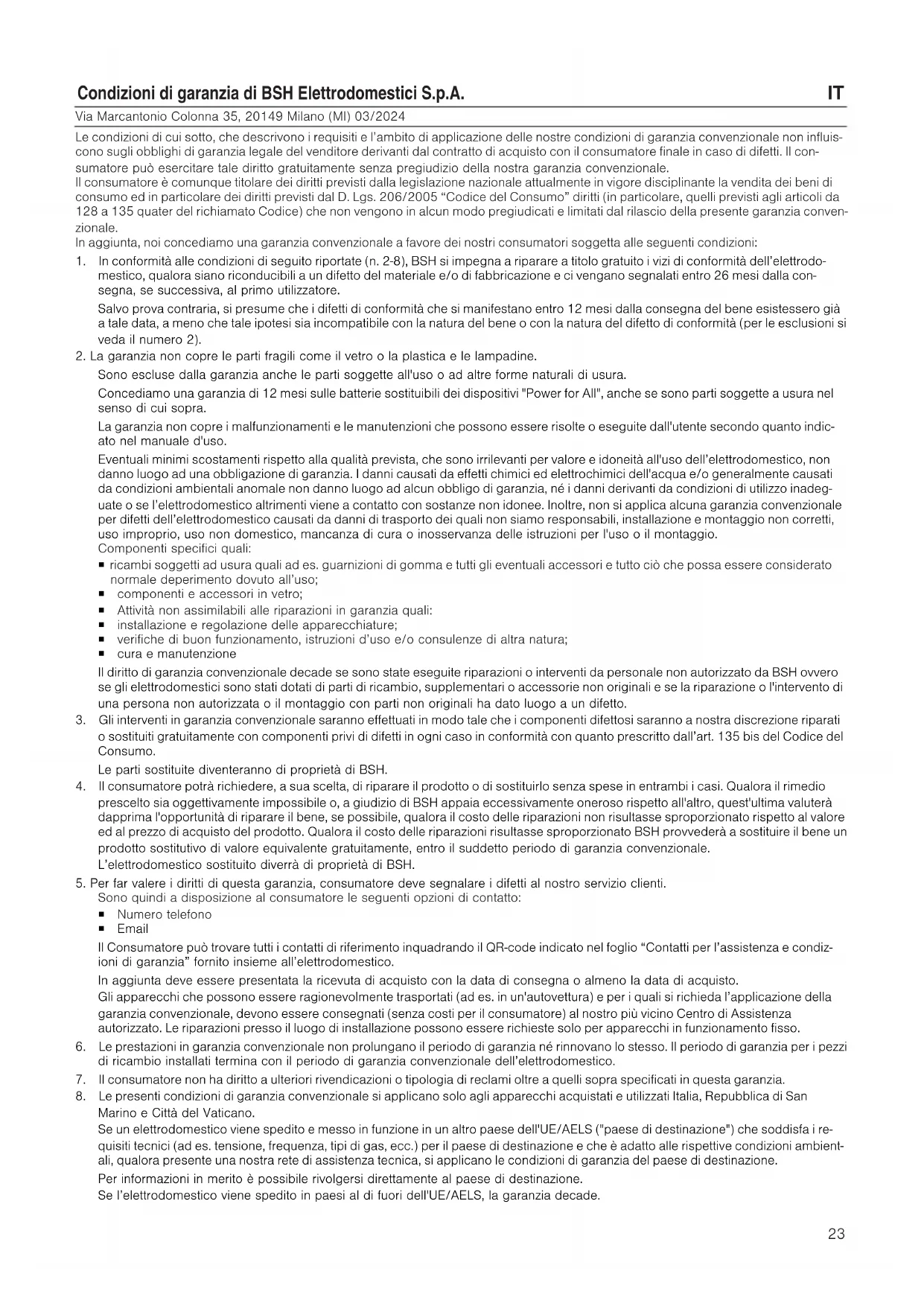 Via Marcantonio Colonna 35, 20149 Milano (MI) 03/2024 Le condizioni di cui sotto, che descrivono i requisiti e l’ambito di applicazione delle nostre condizioni di garanzia convenzionale non influis- cono sugli obblighi di garanzia legale del venditore derivanti dal contratto di acquisto con il consumatore finale in caso di difetti. Il con- sumatore può esercitare tale diritto gratuitamente senza pregiudizio della nostra garanzia convenzionale. Il consumatore è comunque titolare dei diritti previsti dalla legislazione nazionale attualmente in vigore disciplinante la vendita dei beni di consumo ed in particolare dei diritti previsti dal D. Lgs. 206/2005 “Codice del Consumo” diritti (in particolare, quelli previsti agli articoli da 128a135 quater del richiamato Codice) che non vengono in alcun modo pregiudicati e limitati dal rilascio della presente garanzia conven- zionale. In aggiunta, noi concediamo una garanzia convenzionale a favore dei nostri consumatori soggetta alle seguenti condizioni: 1. In conformità alle condizioni di seguito riportate (n. 2-8), BSH si impegna a riparare a titolo gratuito i vizi di conformità dell’elettrodo- mestico, qualora siano riconducibili a un difetto del materiale e/o di fabbricazione e ci vengano segnalati entro 26 mesi dalla con- segna, se successiva, al primo utilizzatore. Salvo prova contraria, si presume che i difetti di conformità che si manifestano entro 12 mesi dalla consegna del bene esistessero già a tale data, a meno che tale ipotesi sia incompatibile con la natura del bene o con la natura del difetto di conformità (per le esclusioni si veda il numero 2).