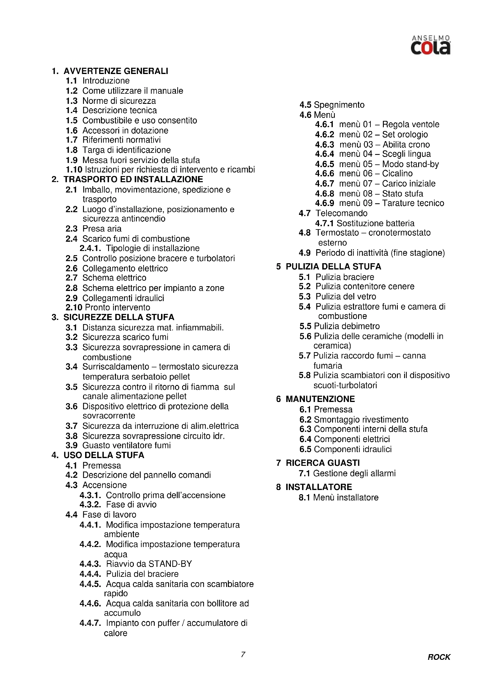 COLA S.r.l. – Viale del Lavoro, 7/9 – 37040 Arcole (VR) Italy – Tel. 045 7635780 – 045 6144043 – Cod. Fisc. – P.IVA e Iscr. Reg. Impr. 02990180230 Capitale Sociale Euro 52.000,00 i.v. – R.E.A. VR-301021 – Socio Unico – Fax Amministrazione 045 6100317 – Fax Commerciale 045 7639032 Fax Assistenza 045 7639030 – Fax Logistica 045 6144048 – e-mail: info@anselmocola.com – website: www.colastufe.com Direzione e coordinamento della Ferroli S.p.A. La ditta si riserva di apportare in qualsiasi momento, senza preavviso alcuno, eventuali modifiche tecniche od estetiche ai prodotti. I disegni, le misure, gli schemi ed ogni altra configurazione, sono qui riportati solo a scopo esemplificativo.ROCK
