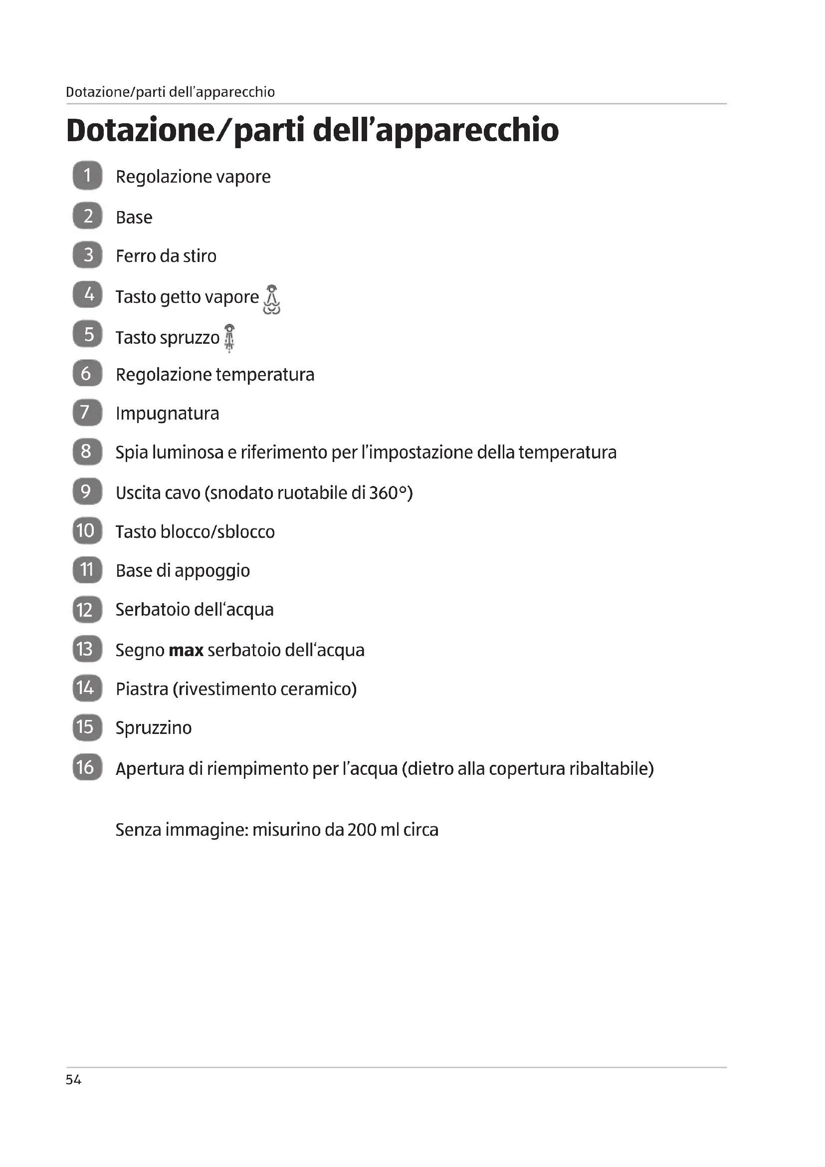 INDICAZIONE! Pericolo di danneggiamento! Un utilizzo non conforme del ferro può comportare dei danni all‘apparecchio. − Utilizzare il ferro da stiro esclusivamente con la base in dotazione. Non utilizzarne altre. − Posizionare il ferro da stiro sulla propria base quando non viene utilizzato. − Estrarre la spina elettrica dalla presa prima di riempire il serbatoio con acqua. − Posizionare sempre la base su una superficie stabile, piana ed esente da vibrazioni. − Il ferro da stiro deve essere utilizzato e poggiato su una superficie stabile. Quando il ferro da stiro viene posizionato sulla propria base di appoggio, accertarsi che la superficie su cui poggia la base di appoggio sia stabile. − Con il ferro da stiro stirare esclusivamente tessuti adatti che possono essere stirati. Se non si è certi che un tessuto possa essere stirato con l’impostazione selezionata, stirare inizialmente una piccola zona non visibile per fare una prova. − Posizionare sempre il ferro da stiro in modo che non possa cadere. Posizionarlo sempre sulla propria base di appoggio o sulla base di ricarica. Il ferro da stiro deve essere utilizzato esclusivamente con la base di appoggio in dotazione. − Svolgere completamente il cavo elettrico prima dell’utilizzo e avvolgerlo esclusivamente dopo che il ferro da stiro si è raffreddato completamente. − Rispettare le indicazioni e i simboli dei tessuti da stirare. I simboli sulla regolazione della temperatura corrispondono ai simboli consueti delle etichette dei tessuti in commercio. − Non pulire il ferro da stiro con spugnette metalliche o detergenti abrasivi. Questi potrebbero danneggiare la superficie della piastra. 03 Buegeleisen kabellos_CH_IT_innen.indd 61 30.11.2017 16:42:19Controllo volume di fornitura