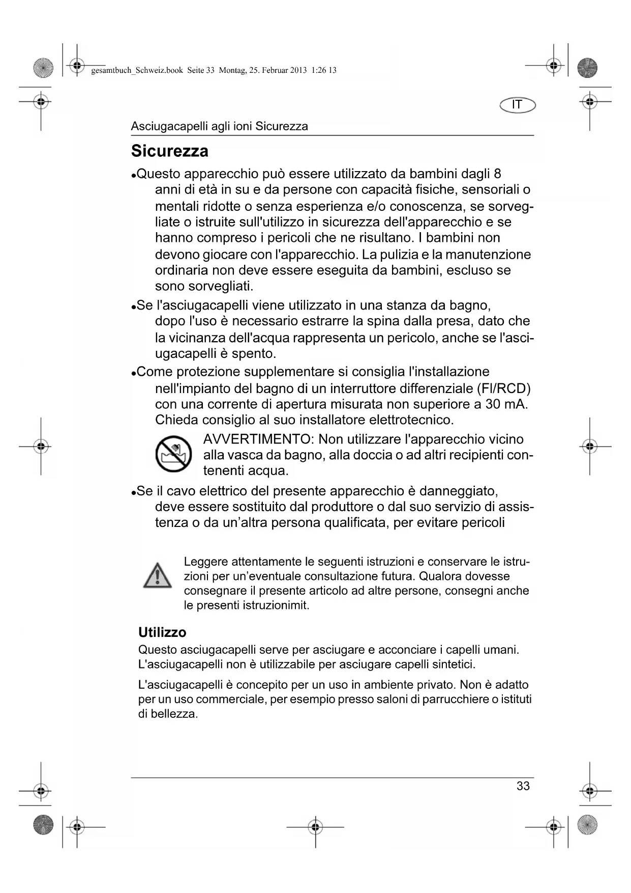Sicurezza Questo apparecchio può essere utilizzato da bambini dagli 8 anni di età in su e da persone con capacità fisiche, sensoriali o mentali ridotte o senza esperienza e/o conoscenza, se sorveg- liate o istruite sull'utilizzo in sicurezza dell'apparecchio e se hanno compreso i pericoli che ne risultano. I bambini non devono giocare con l'apparecchio. La pulizia e la manutenzione ordinaria non deve essere eseguita da bambini, escluso se sono sorvegliati. Se l'asciugacapelli viene utilizzato in una stanza da bagno, dopo l'uso è necessario estrarre la spina dalla presa, dato che la vicinanza dell'acqua rappresenta un pericolo, anche se l'asci- ugacapelli è spento. Come protezione supplementare si consiglia l'installazione nell'impianto del bagno di un interruttore differenziale (Fl/RCD) con una corrente di apertura misurata non superiore a 30 mA. Chieda consiglio al suo installatore elettrotecnico. AVVERTIMENTO: Non utilizzare l'apparecchio vicino alla vasca da bagno, alla doccia o ad altri recipienti con- tenenti acqua. Se il cavo elettrico del presente apparecchio è danneggiato, deve essere sostituito dal produttore o dal suo servizio di assis- tenza o da un’altra persona qualificata, per evitare pericoli Leggere attentamente le seguenti istruzioni e conservare le istru- zioni per un’eventuale consultazione futura. Qualora dovesse consegnare il presente articolo ad altre persone, consegni anche le presenti istruzionimit. Utilizzo Questo asciugacapelli serve per asciugare e acconciare i capelli umani. L'asciugacapelli non è utilizzabile per asciugare capelli sintetici. L'asciugacapelli è concepito per un uso in ambiente privato. Non è adatto per un uso commerciale, per esempio presso saloni di parrucchiere o istituti di bellezza. gesamtbuch_Schweiz.book Seite 33 Montag, 25. Februar 2013 1:26 13Asciugacapelli agli ioni Sicurezza