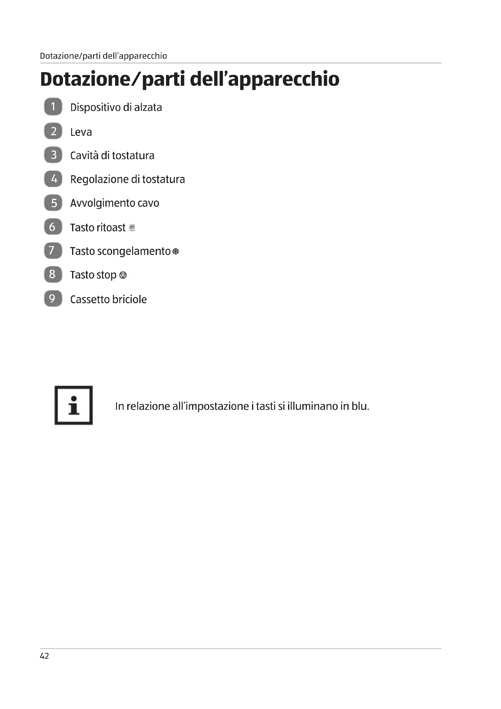 Il tostapane dispone di una protezione contro il surriscaldamento. In caso di surriscaldamento per utilizzo errato, il processo di tostatura in corso viene terminato automaticamente. È possibile riutilizza- re solo il tostapane una volta che si è raffreddato a temperatura ambiente. Prima messa in servizio Controllare il tostapane e la dotazione AVVISO! Pericolo di danni! Se la confezione viene aperta con scarsa cautela con un coltello af- filato o con altri oggetti appuntiti il tostapane potrebbe essere dan- neggiato. − Fare attenzione durante l’apertura della confezione.