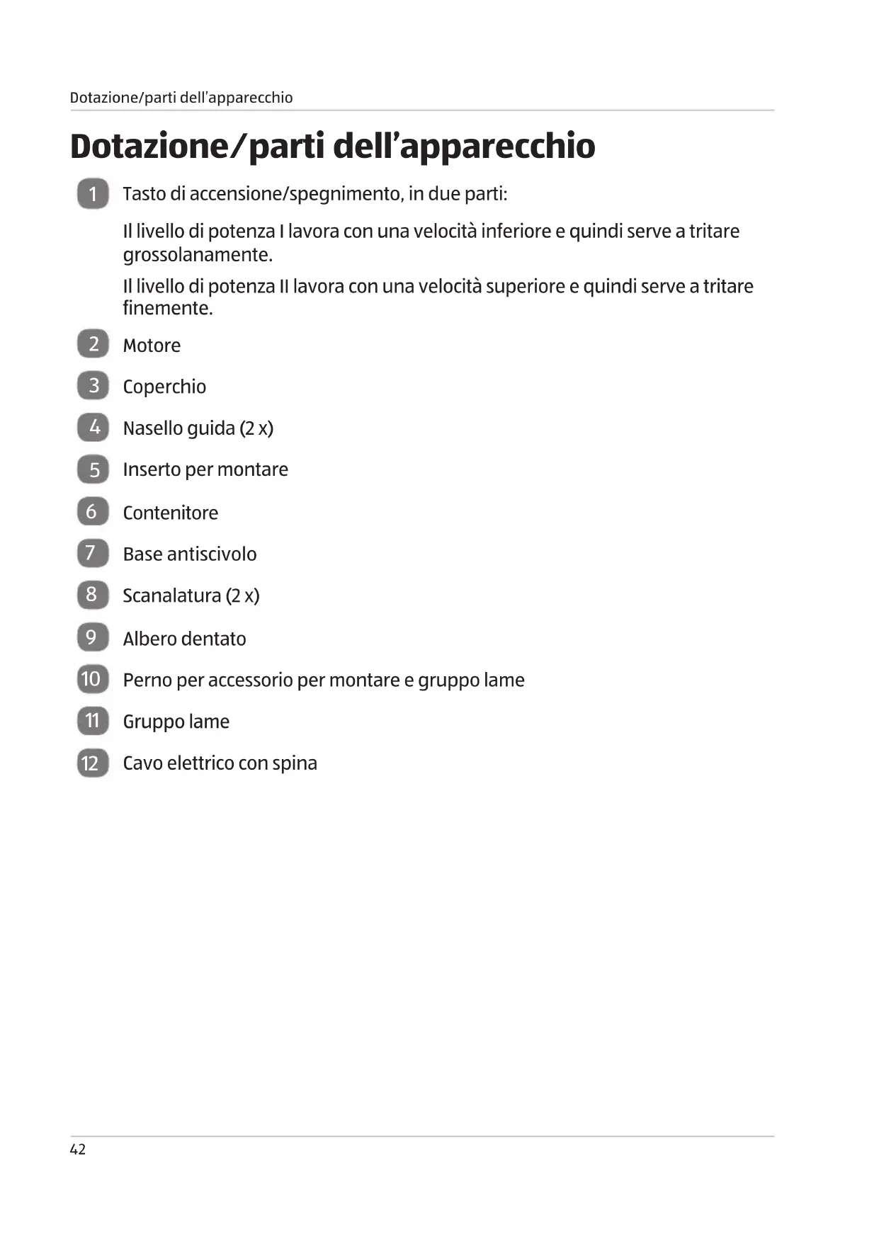 Tasto di accensione/spegnimento, in due parti: Il livello di potenza I lavora con una velocità inferiore e quindi serve a tritare grossolanamente. Il livello di potenza II lavora con una velocità superiore e quindi serve a tritare finemente.