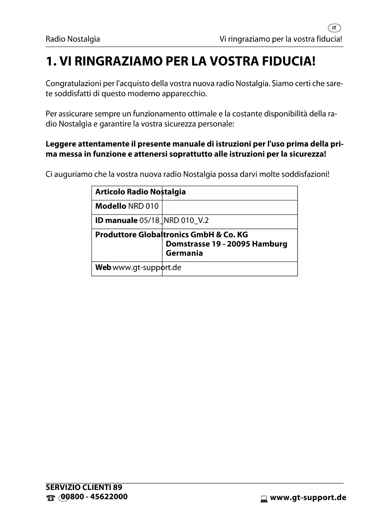 Congratulazioni per l'acquisto della vostra nuova radio Nostalgia. Siamo certi che sare- te soddisfatti di questo moderno apparecchio. Per assicurare sempre un funzionamento ottimale e la costante disponibilità della ra- dio Nostalgia e garantire la vostra sicurezza personale: Leggere attentamente il presente manuale di istruzioni per l'uso prima della pri- ma messa in funzione e attenersi soprattutto alle istruzioni per la sicurezza! Ci auguriamo che la vostra nuova radio Nostalgia possa darvi molte soddisfazioni! Articolo Radio Nostalgia Modello NRD 010 ID manuale 05/18_NRD 010_V.2 Produttore Globaltronics GmbH & Co. KG Domstrasse 19 - 20095 Hamburg Germania Web www.gt-support.de NRD010_2018.book Seite 89 Mittwoch, 29. August 2018 1:52 13Indicazioni generali Radio Nostalgia