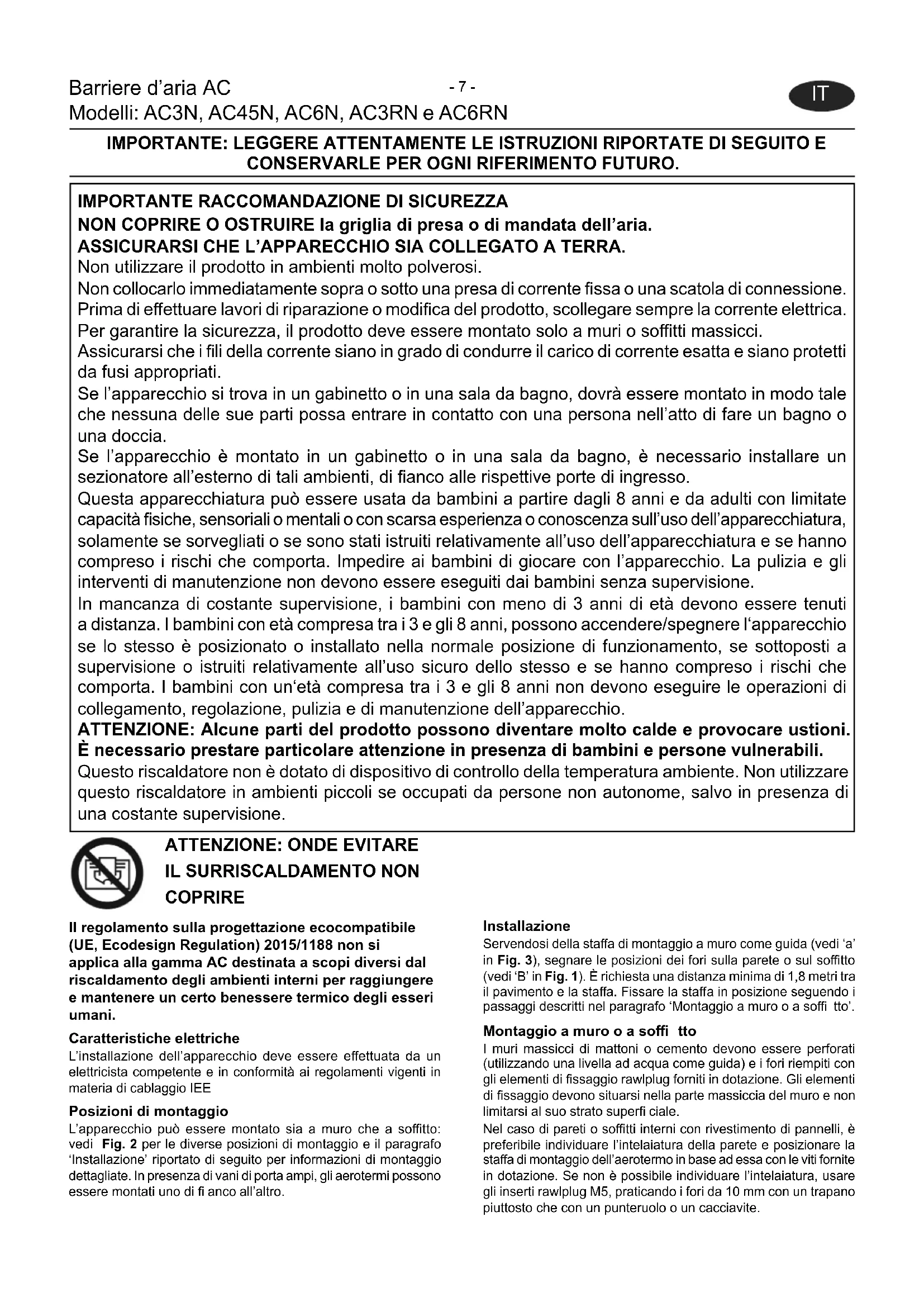 COPRIREPosizionare l’aerotermo sulla staff a di montaggio accertandosi che le viti pozi siano completamente inserite nelle fessure della staff a. È importante che la rondella dentellata in metallo (a) si trovi tra la staff a di sostegno dell’aerotermo (b) e la staff a di montaggio a muro (c). Regolare l’aerotermo sull’angolo richiesto, quindi serrare saldamente la vite di fissaggio (d) dentro il cappuccio terminale (e) con un cacciavite con punta a croce (f) come mostrato in Fig. 4. Collegamento elettrico Svitare la vite su ciascun lato della griglia di mandata dell’aria (vedi Fig. 5) per accedere ai terminali e collegare il cavo dell’alimentazione (vedi Fig. 6). Posare il cavo dell’alimentazione di rete lungo l’esterno del pannello posteriore (non all’interno) e inserirlo nel fermacavo posteriore, quindi eseguire il collegamento come mostrato in Fig. 6 (vedi anche Fig. 7 per rappresentazioni dettagliate del fermacavo). La Fig. 7a mostra in dettaglio il fermacavo nei modelli AC3N e AC3RN. La Fig. 7b mostra in dettaglio il fermacavo nei modelli AC45N e AC6N. Nota: la parte ‘A’ del fermacavo è capovolta per ricevere un cavo più grande. Nei modelli AC3N, AC3RN e AC45N, il collegamento al cablaggio fi sso deve essere eseguito mediante un interruttore bipolare adiacente di minimo 20 amp. Nel modello AC6N, il collegamento al cablaggio fi sso deve essere eseguito mediante un interruttore bipolare adiacente di minimo 30 amp con una separazione minima di 3 mm per ciascun polo. Rimettere in sede la griglia di mandata dell’aria. Prima della messa in funzione dell’apparecchio, verifi care che la barriera d’aria sia fi ssata saldamente in posizione e che i cavi elettrici siano agganciati correttamente. Funzionamento (modelli AC3N, AC45N e AC6N) Collegare l’aerotermo alla corrente elettrica. L’interruttore contrassegnato con ‘I’ aziona il ventilatore. Selezionare ‘l’ e gli interruttori più piccoli contrassegnati con ‘’ come richiesto (vedi Fig. 9) Impostazioni - I : Ventilatore acceso I + : Calore medio I + + : Calore massimo Funzionamento (modello AC3RN e AC6RN) Collegare l’aerotermo alla corrente elettrica. Selezionare la posizione ‘MAN’ per il funzionamento manuale. Selezionare la posizione ‘AUTO’ per il funzionamento con il telecomando. Selezionare l’emissione di calore desiderata mediante gli interruttori più piccoli contrassegnati con ‘’ (vedi Fig. 10). Per usare il telecomando, è necessario selezionare prima ‘AUTO’. L’aerotermo può ora essere acceso o spento mediante il telecomando (vedi Fig. 8). Impostazioni - MAN : Ventilatore acceso AUTO : Ventilatore acceso o spento (mediante telecomando I / O) MAN / AUTO + : Calore medio MAN / AUTO + + : Calore massimo Quando il telecomando non è in uso, l’impostazione ‘ AUTO ’ è automaticamente disattivata. NOTA: il collegamento con il telecomando è a raggi infrarossi e la sua portata è di 8 m. Se il telecomando perde il collegamento, scollegare l’alimentazione elettrica per almeno 30 secondi e selezionare ‘MAN’ per il funzionamento manuale. Telecomando (solo modello AC3RN e AC6RN) Inserire 2 batterie AAA da 1,5 volt nel ricevitore del telecomando. Impostare l’aerotermo su ‘AUTO’ per il funzionamento automatico. Premere il pulsante I per attivare l’aerotermo e il pulsante O per spegnerlo. Se l’aerotermo non si accende con il telecomando, controllare le batterie e quindi puntare il telecomando direttamente verso l‘aerotermo per accenderlo. Il telecomando può essere riposto nella custodia da montare a muro fornita in dotazione (vedi Fig. 8). Anche le viti e gli elementi di fi ssaggio rawlplug necessari per il montaggio sono forniti con il prodotto. Informazioni importanti sulla batteria In caso di perdite, eliminare le batterie. Per lo smaltimento delle batterie, fare riferimento alle norme ambientali locali. L’eventuale uso di batterie di tipi diversi, l’installazione errata, la mancata sostituzione di tutte le batterie allo stesso tempo, il contatto con il fuoco o il tentativo di ricaricare batterie non ricaricabili possono causare perdite di elettrolito. Interruttori di sicurezza termici L’alimentazione elettrica degli elementi di riscaldamento viene automaticamente interrotta qualora si verifi chi uno o più dei seguenti casi: