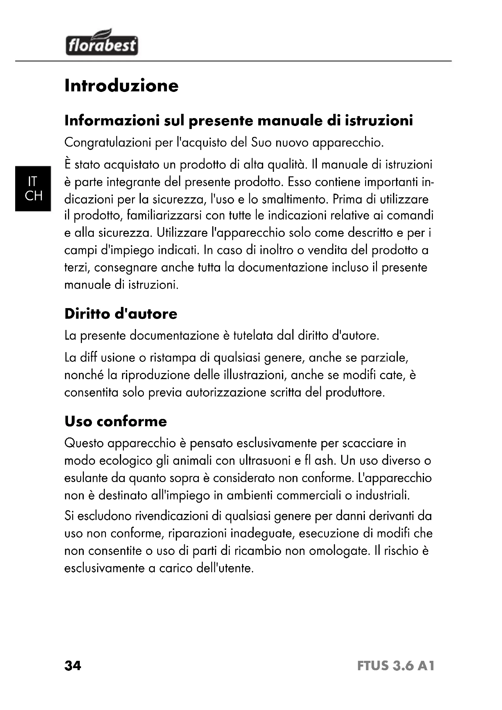 FTUS 3.6 A1 Introduzione Informazioni sul presente manuale di istruzioni Congratulazioni per l'acquisto del Suo nuovo apparecchio. È stato acquistato un prodotto di alta qualità. Il manuale di istruzioni è parte integrante del presente prodotto. Esso contiene importanti in- dicazioni per la sicurezza, l'uso e lo smaltimento. Prima di utilizzare il prodotto, familiarizzarsi con tutte le indicazioni relative ai comandi e alla sicurezza. Utilizzare l'apparecchio solo come descritto e per i campi d'impiego indicati. In caso di inoltro o vendita del prodotto a terzi, consegnare anche tutta la documentazione incluso il presente manuale di istruzioni. Diritto d'autore La presente documentazione è tutelata dal diritto d'autore. La diff usione o ristampa di qualsiasi genere, anche se parziale, nonché la riproduzione delle illustrazioni, anche se modifi cate, è consentita solo previa autorizzazione scritta del produttore. Uso conforme Questo apparecchio è pensato esclusivamente per scacciare in modo ecologico gli animali con ultrasuoni e fl ash. Un uso diverso o esulante da quanto sopra è considerato non conforme. L'apparecchio non è destinato all'impiego in ambienti commerciali o industriali. Si escludono rivendicazioni di qualsiasi genere per danni derivanti da uso non conforme, riparazioni inadeguate, esecuzione di modifi che non consentite o uso di parti di ricambio non omologate. Il rischio è esclusivamente a carico dell'utente. IB_30865_FTUS3.6A1_LB1.indb 34IB_30865_FTUS3.6A1_LB1.indb 34 17.10.14 10:2517.10.14 10:2535 FTUS 3.6 A1