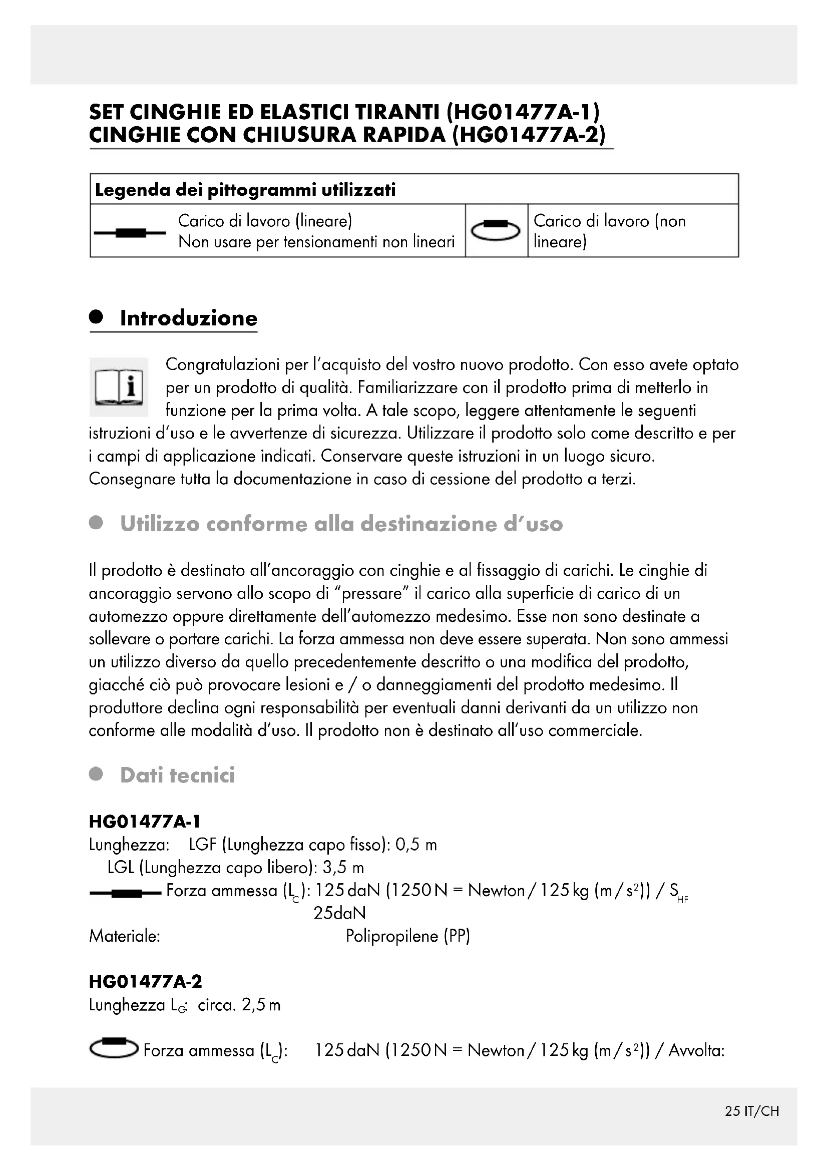 ATTENZIONE! PERICOLO DI MORTE E DI INCIDENTI PER BAMBINI E INFANTI! Non lasciare mai i bambini incustoditi nei pressi del materiale per imballaggio e del prodotto. Sussiste il pericolo di soffocamento a causa del materiale per imballaggio nonché un pericolo di morte a seguito di strangolamento. Spesso i bambini sottovalutano i pericoli. Tenere sempre i bambini lontani dal prodotto. Il prodotto non è un giocattolo. J Non utilizzare più il prodotto quando è danneggiato. J Controllare che tutti i componenti siano montati correttamente. In caso di montaggio non corretto sussiste il pericolo di lesioni. Indicazioni di sicurezza per cinghie di ancoraggio J Controllare la cinghia di ancoraggio prima di utilizzarla, e ciò per verificare l’eventuale presenza di danneggiamenti. Non utilizzare in alcun caso la cinghia di ancoraggio in presenza di danni alla cinghia. J Verificare con cura l’eventuale presenza di materiali aggressivi o altri materiali che metterebbero a rischio l’utilizzo del prodotto che potrebbero essere incollati sul prodotto medesimo. Se necessario, farle verificare dal produttore. J Fare controllare le cinghie di ancoraggio e tutti i suoi componenti almeno una volta l’anno da una persona esperta. A seconda delle condizioni di utilizzo e delle caratteristiche27 IT/CH di esercizio potrebbe diventare necessario fare svolgere di tanto in tanto ulteriori controlli da parte di un esperto. J Non utilizzare in alcun caso la cinghia di ancoraggio in presenza di: - Rotture o tagli nel filo, in modo particolare di tagli sugli spigoli o altri danni che possono dare origini a lesioni - contrassegno mancante o non più leggibile - danneggiamento dei collegamenti, deformazione per l’influsso di calore (sfregamento, irraggiamento) - danni determinati dall’azione di materiali aggressivi. J Non utilizzare i dispositivi di tensionamento in presenza di: - criccature, rotture o notevoli manifestazioni di corrosione o danni derivanti da corrosione - dilatazione > 5 % (5 % nella bocca del gancio o deformazioni generiche) - deformazione stabile riconoscibile ad elementi portanti. J Le riparazioni ad una cinghia di ancoraggio possono essere eseguite solamente quando i dati relativi al produttore, al materiale e alla forza di trazione massima ammessa non sono più constatabili con chiarezza. Tali riparazioni possono essere eseguite dal produttore o da persone da lui incaricate. Queste devono assicurare che le cinghie di ancoraggio di nuovo pronte all’uso dopo la riparazione raggiungono la forza di trazione massima indicata originariamente sull‘etichetta. J Non caricare mai la cinghia di ancoraggio oltre la forza di trazione ammessa indicata (vedi anche il capitolo “Dati tecnici”). J Scegliere la cinghia di ancoraggio adatta in base al tipo di ancoraggio, alla forza di trazione e alla superficie di carico (vedi etichetta del contrassegno). ATTENZIONE! PERICOLO DI INCIDENTE! Scegliere sempre cinghie, punti e metodi di ancoraggio adatti. Non solo le dimensioni, la forme e il peso del carico ma anche il tipo di utilizzo, l’ambiente di trasporto ed il tipo di carico determinano la scelta dell’ancoraggio corretto da utilizzare. J Assicurarsi anche che i modelli di automezzo ai quali il carico deve essere fissato, siano sufficientemente stabili. ATTENZIONE! Oltre alle forze di accelerazione esistenti, durante il viaggio possono essere attive anche forze laterali a causa del vento. J Non tirare ma la cinghia di ancoraggio su superfici ruvide o spigoli aguzzi, qualora questi non siano forniti di protezione adatta. J Fare attenzione a che le cinghie di ancoraggio non vengano sfalsate e svolgano la propria funzione di sostegno con l’intera larghezza. J Non porre alcun oggetto sulla cinghia di ancoraggio, qualora questa, in tale modo, possa esserne danneggiata. J Tenere lontano la cinghia di ancoraggio da superfici calde. J Distribuire le cinghie di ancoraggio uniformemente sul carico da fissare. J Non utilizzare mai le cinghie di ancoraggio quale accessorio di imbracatura. J Fare attenzione a che i ganci ad S non siano caricati sulla loro punta, giacché non si tratta di ganci adatti a tale particolare scopo. Apporre i ganci di ancoraggio sempre28 IT/CH dall’interno verso l’esterno al fine di evitare uno sganciamento privo di sicura in un punto di ancoraggio sulla superficie di carico. J Non apporre mai ganci ad S e cricchetti su spigoli. J Non prolungare mai la maniglia di arresto per ottenere maggiori forze di tensionamento, qualora tale azione non sia espressamente autorizzata dalle istruzioni d‘uso. ATTENZIONE! PERICOLO DI INCIDENTE! Qualora si utilizzassero ferramenta e dispositivi di ancoraggio aggiuntivi fare attenzione a che questi siano adatti alla cinghia di ancoraggio in uso. J Per un fissaggio sicuro del carico devono essere applicati sul cricchetto almeno 1,5 avvolgimenti della cinghia. J Per tensionare il carico, tensionare la cinghia manualmente fino al punto in cui non si possono applicare sul cricchetto più di 3 avvolgimenti del nastro. J Con riferimento al carico sul tettuccio non superare mai le indicazioni fornite dal produttore. ATTENZIONE! PERICOLO DI INCIDENTE! Eseguendo l’ancoraggio ad attrito fare attenzione alla forza di serraggio necessaria. Sono necessarie almeno due cinghie di ancoraggio. Per motivi di stabilità devono essere utilizzate almeno due cinghie di ancoraggio uguali per l’ancoraggio ad attrito e due coppie di cinghie di ancoraggio uguali per l’ancoraggio diagonale. ATTENZIONE! PERICOLO DI INCIDENTE! Durante il viaggio controllare con regolarità che il carico sia ancora ancorato correttamente, e se necessario tensionare nuovamente la cinghia di ancoraggio.