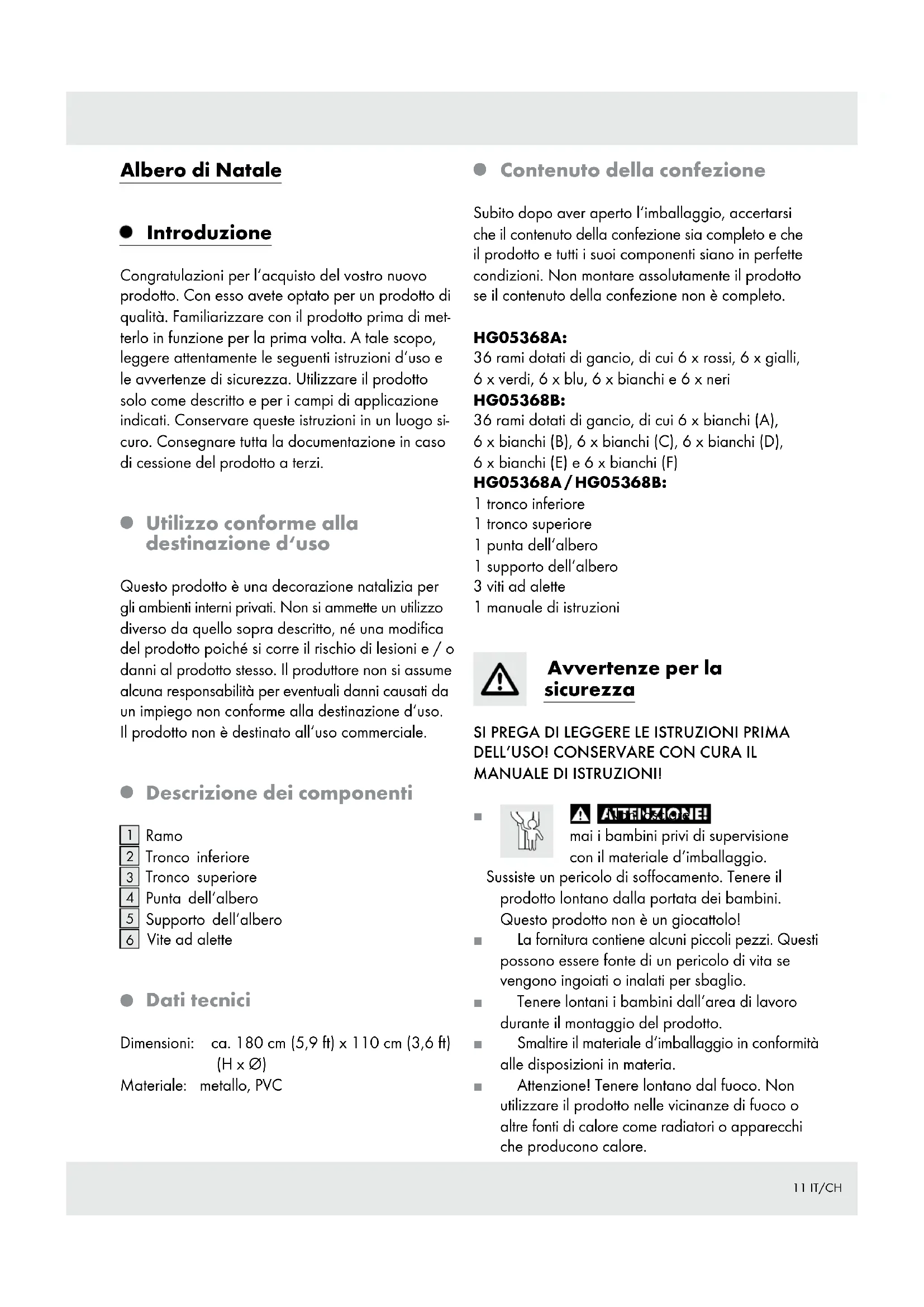 Contenuto della confezione Subito dopo aver aperto l‘imballaggio, accertarsi che il contenuto della confezione sia completo e che il prodotto e tutti i suoi componenti siano in perfette condizioni. Non montare assolutamente il prodotto se il contenuto della confezione non è completo. HG05368A: 36 rami dotati di gancio, di cui 6 x rossi, 6 x gialli, 6 x verdi, 6 x blu, 6 x bianchi e 6 x neri HG05368B: 36 rami dotati di gancio, di cui 6 x bianchi (A), 6 x bianchi (B), 6 x bianchi (C), 6 x bianchi (D), 6 x bianchi (E) e 6 x bianchi (F) HG05368A / HG05368B: 1 tronco inferiore 1 tronco superiore 1 punta dell‘albero 1 supporto dell‘albero 3 viti ad alette 1 manuale di istruzioni Avvertenze per la sicurezza SI PREGA DI LEGGERE LE ISTRUZIONI PRIMA