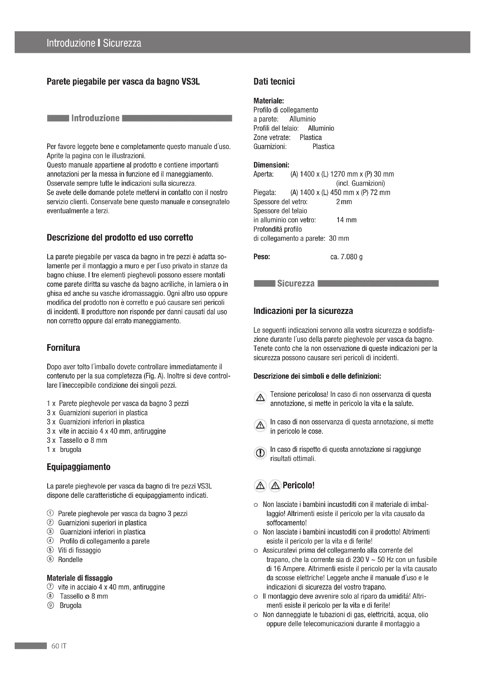 Parete piegabile per vasca da bagno VS3L Introduzione Per favore leggete bene e completamente questo manuale d´uso. Aprite la pagina con le illustrazioni. Questo manuale appartiene al prodotto e contiene importanti annotazioni per la messa in funzione ed il maneggiamento. Osservate sempre tutte le indicazioni sulla sicurezza. Se avete delle domande potete mettervi in contatto con il nostro servizio clienti. Conservate bene questo manuale e consegnatelo eventualmente a terzi. Descrizione del prodotto ed uso corretto La parete piegabile per vasca da bagno in tre pezzi è adatta so- lamente per il montaggio a muro e per l´uso privato in stanze da bagno chiuse. I tre elementi pieghevoli possono essere montati come parete diritta su vasche da bagno acriliche, in lamiera o in ghisa ed anche su vasche idromassaggio. Ogni altro uso oppure modifica del prodotto non è corretto e puó causare seri pericoli di incidenti. Il produttore non risponde per danni causati dal uso non corretto oppure dal errato maneggiamento. Fornitura Dopo aver tolto l´imballo dovete controllare immediatamente il contenuto per la sua completezza (Fig. A). Inoltre si deve control- lare l´ineccepibile condizione dei singoli pezzi. 1 x Parete pieghevole per vasca da bagno 3 pezzi 3 x Guarnizioni superiori in plastica 3 x Guarnizioni inferiori in plastica 3 x vite in acciaio 4 x 40 mm, antiruggine 3 x Tassello ø 8 mm Equipaggiamento La parete pieghevole per vasca da bagno di tre pezzi VS3L dispone delle caratteristiche di equipaggiamento indicati.