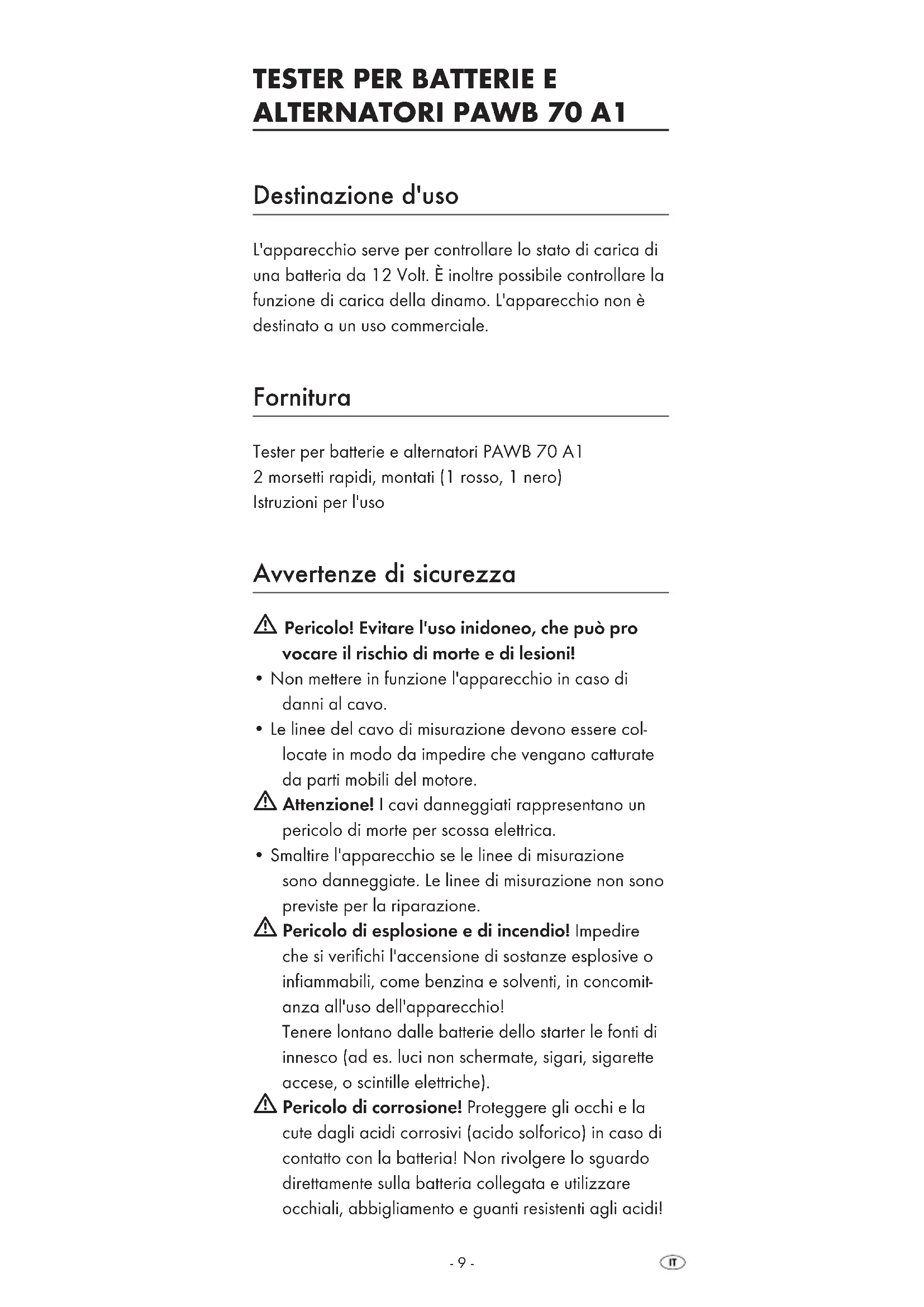Destinazione d'uso L'apparecchio serve per controllare lo stato di carica di una batteria da 12 Volt. È inoltre possibile controllare la funzione di carica della dinamo. L'apparecchio non è destinato a un uso commerciale. Fornitura Tester per batterie e alternatori PAWB 70 A1 2 morsetti rapidi, montati (1 rosso, 1 nero) Istruzioni per l'uso Avvertenze di sicurezza Pericolo! Evitare l'uso inidoneo, che può pro vocare il rischio di morte e di lesioni!