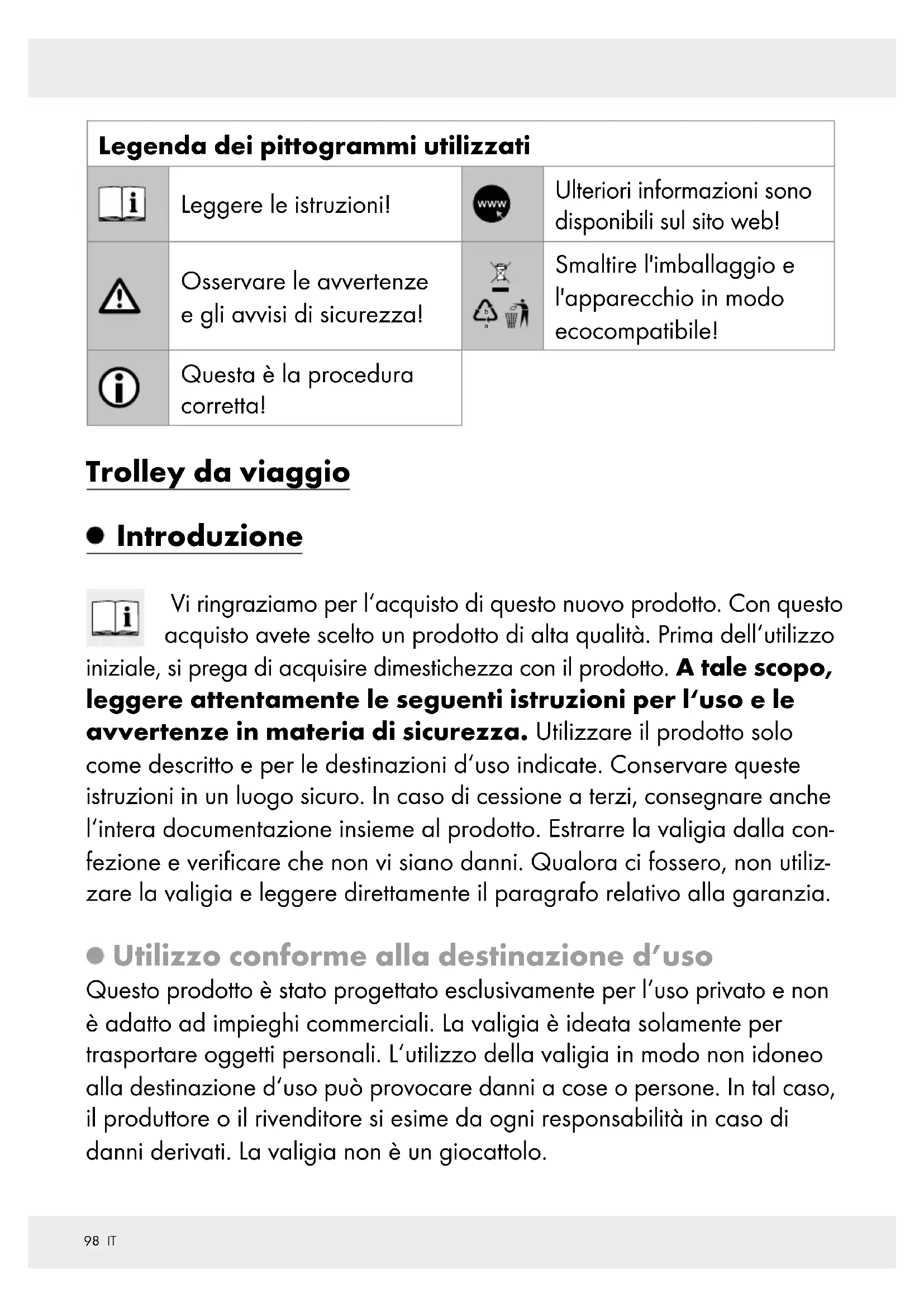 Smaltire l'imballaggio e l'apparecchio in modo ecocompatibile! Questa è la procedura corretta! Trolley da viaggio Introduzione Vi ringraziamo per l‘acquisto di questo nuovo prodotto. Con questo acquisto avete scelto un prodotto di alta qualità. Prima dell‘utilizzo iniziale, si prega di acquisire dimestichezza con il prodotto. A tale scopo, leggere attentamente le seguenti istruzioni per l‘uso e le avvertenze in materia di sicurezza. Utilizzare il prodotto solo come descritto e per le destinazioni d‘uso indicate. Conservare queste istruzioni in un luogo sicuro. In caso di cessione a terzi, consegnare anche l‘intera documentazione insieme al prodotto. Estrarre la valigia dalla con- fezione e verificare che non vi siano danni. Qualora ci fossero, non utiliz- zare la valigia e leggere direttamente il paragrafo relativo alla garanzia. Utilizzo conforme alla destinazione d’uso Questo prodotto è stato progettato esclusivamente per l‘uso privato e non è adatto ad impieghi commerciali. La valigia è ideata solamente per trasportare oggetti personali. L‘utilizzo della valigia in modo non idoneo alla destinazione d‘uso può provocare danni a cose o persone. In tal caso, il produttore o il rivenditore si esime da ogni responsabilità in caso di danni derivati. La valigia non è un giocattolo.99 IT Descrizione dei componenti