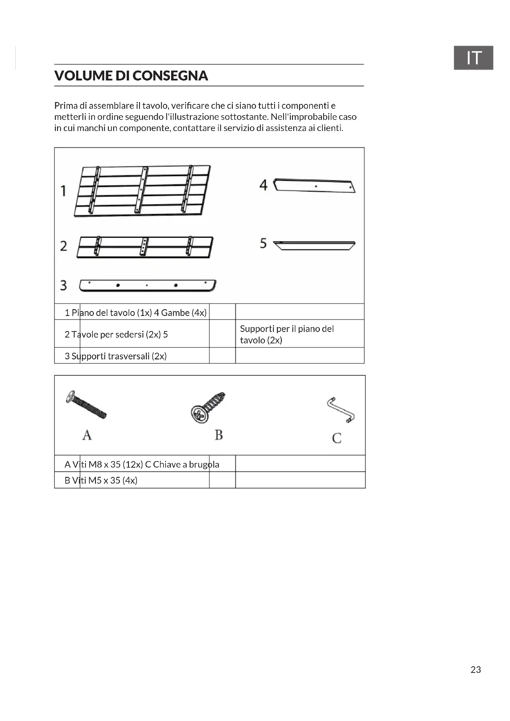 Prima di assemblare il tavolo, vericare che ci siano tutti i componenti e metterli in ordine seguendo l'illustrazione sottostante. Nell'improbabile caso in cui manchi un componente, contattare il servizio di assistenza ai clienti. 1 Piano del tavolo (1x) 4 Gambe (4x) 2 Tavole per sedersi (2x) 5 Supporti per il piano del tavolo (2x) 3 Supporti trasversali (2x) A Viti M8 x 35 (12x) C Chiave a brugola B Viti M5 x 35 (4x)24