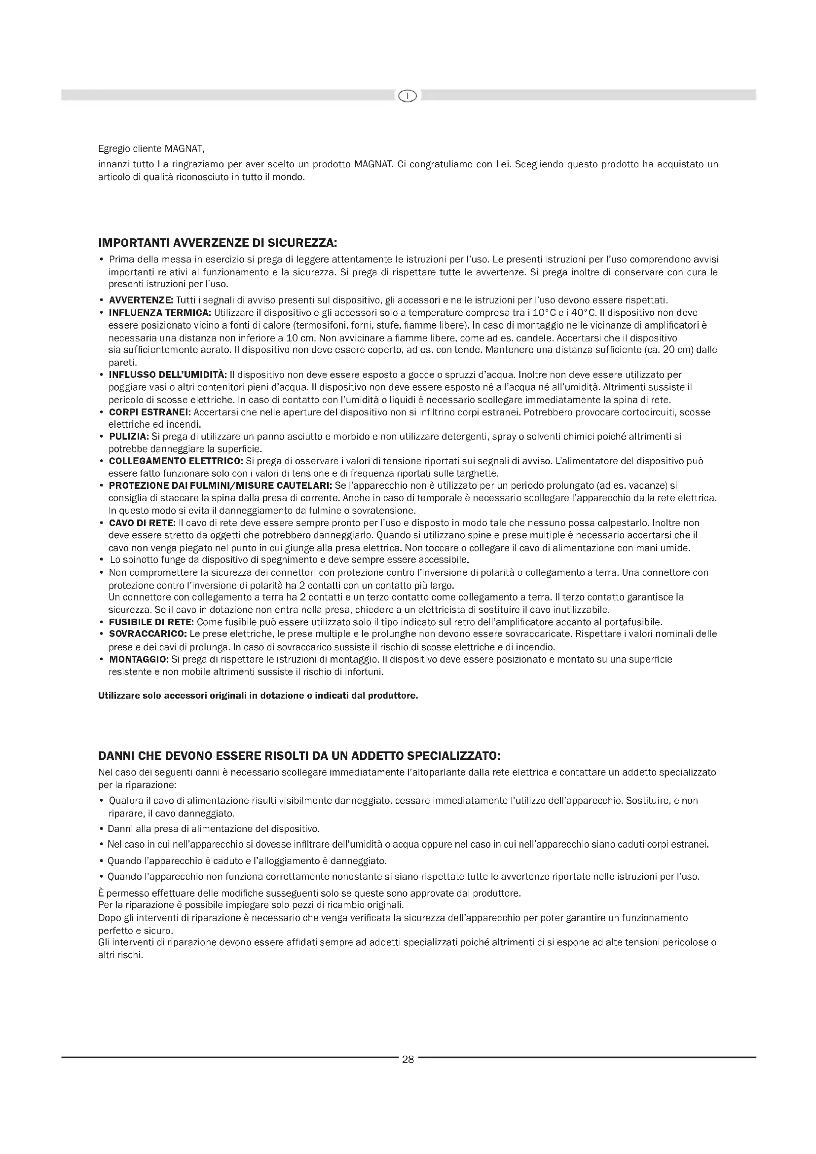 - CORPI ESTRANEI: Accertarsi che nelle aperture del dispositivo non si inltrino corpi estranei. Potrebbero provocare cortocircuiti, scosse elettriche ed incendi.