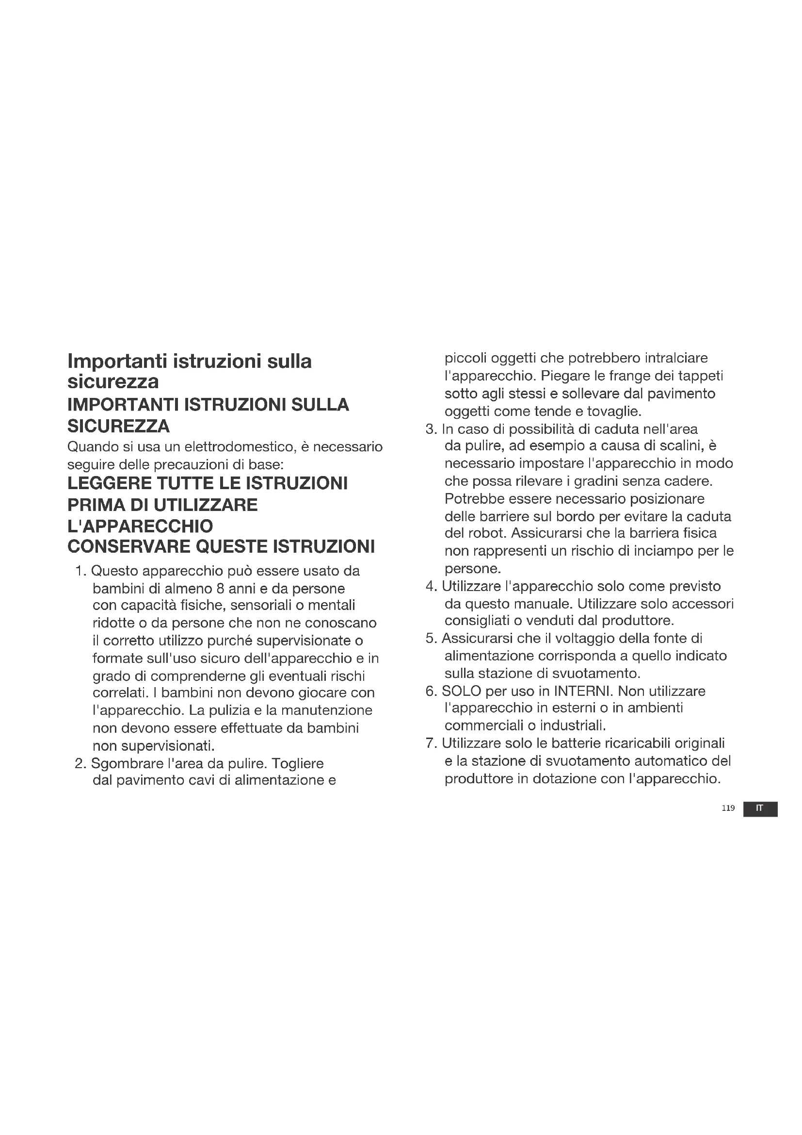 da pulire, ad esempio a causa di scalini, è necessario impostare l'apparecchio in modo che possa rilevare i gradini senza cadere. Potrebbe essere necessario posizionare delle barriere sul bordo per evitare la caduta del robot. Assicurarsi che la barriera fisica non rappresenti un rischio di inciampo per le persone.