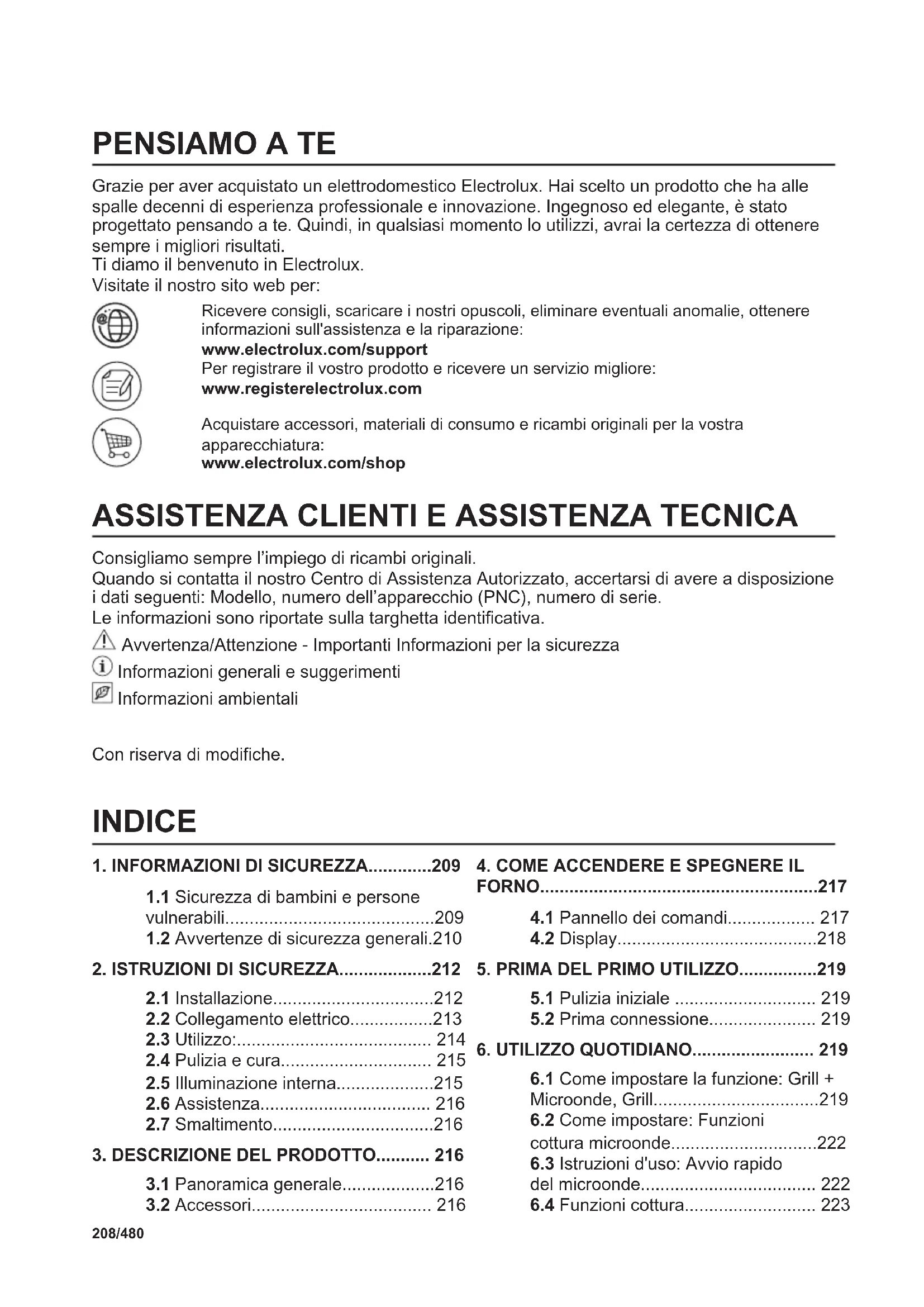 Grazie per aver acquistato un elettrodomestico Electrolux. Hai scelto un prodotto che ha alle spalle decenni di esperienza professionale e innovazione. Ingegnoso ed elegante, è stato progettato pensando a te. Quindi, in qualsiasi momento lo utilizzi, avrai la certezza di ottenere sempre i migliori risultati. Ti diamo il benvenuto in Electrolux. Visitate il nostro sito web per: Ricevere consigli, scaricare i nostri opuscoli, eliminare eventuali anomalie, ottenere informazioni sull'assistenza e la riparazione: www.electrolux.com/support Per registrare il vostro prodotto e ricevere un servizio migliore: www.registerelectrolux.com Acquistare accessori, materiali di consumo e ricambi originali per la vostra apparecchiatura: www.electrolux.com/shop