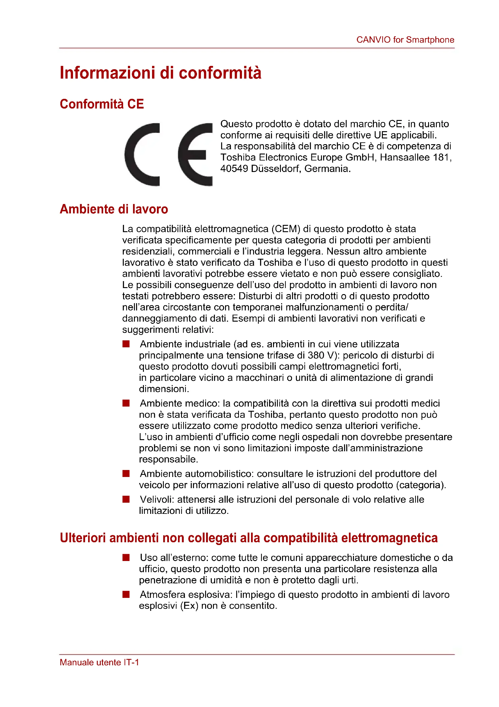a Microsoft Corporation bejegyzett védjegye az Egyesült Államokban és/vagy egyéb országokban. A C-típusú USB-port (USB Type-C™) az USB Implementers Forum védjegye. A jelen dokumentumban említett vagy szereplő egyéb védjegyek a megfelelő tulajdonos tulajdonát képezik. A tévedés és kihagyás joga fenntartva.Manuale utente IT-1 CANVIO for Smartphone Manuale utente Informazioni di conformità Conformità CE Questo prodotto è dotato del marchio CE, in quanto conforme ai requisiti delle direttive UE applicabili. La responsabilità del marchio CE è di competenza di Toshiba Electronics Europe GmbH, Hansaallee 181, 40549 Düsseldorf, Germania. Ambiente di lavoro La compatibilità elettromagnetica (CEM) di questo prodotto è stata verificata specificamente per questa categoria di prodotti per ambienti residenziali, commerciali e l’industria leggera. Nessun altro ambiente lavorativo è stato verificato da Toshiba e l’uso di questo prodotto in questi ambienti lavorativi potrebbe essere vietato e non può essere consigliato. Le possibili conseguenze dell’uso del prodotto in ambienti di lavoro non testati potrebbero essere: Disturbi di altri prodotti o di questo prodotto nell’area circostante con temporanei malfunzionamenti o perdita/ danneggiamento di dati. Esempi di ambienti lavorativi non verificati e suggerimenti relativi: ■ Ambiente industriale (ad es. ambienti in cui viene utilizzata principalmente una tensione trifase di 380 V): pericolo di disturbi di questo prodotto dovuti possibili campi elettromagnetici forti, in particolare vicino a macchinari o unità di alimentazione di grandi dimensioni. ■ Ambiente medico: la compatibilità con la direttiva sui prodotti medici non è stata verificata da Toshiba, pertanto questo prodotto non può essere utilizzato come prodotto medico senza ulteriori verifiche. L’uso in ambienti d’ufficio come negli ospedali non dovrebbe presentare problemi se non vi sono limitazioni imposte dall’amministrazione responsabile. ■ Ambiente automobilistico: consultare le istruzioni del produttore del veicolo per informazioni relative all’uso di questo prodotto (categoria). ■ Velivoli: attenersi alle istruzioni del personale di volo relative alle limitazioni di utilizzo. Ulteriori ambienti non collegati alla compatibilità elettromagnetica ■ Uso all’esterno: come tutte le comuni apparecchiature domestiche o da ufficio, questo prodotto non presenta una particolare resistenza alla penetrazione di umidità e non è protetto dagli urti. ■ Atmosfera esplosiva: l’impiego di questo prodotto in ambienti di lavoro esplosivi (Ex) non è consentito.IT-2 Manuale utente CANVIO for Smartphone Informazioni valide esclusivamente per gli stati membri dell’Unione Europea: Dichiarazione di conformità REACH La nuova normativa dell’Unione Europea (UE) in materia di sostanze chimiche, REACH (Registration, Evaluation, Authorization and Restriction of Chemicals - Registrazione, valutazione, autorizzazione e restrizione delle sostanze chimiche), è entrata in vigore il 1° giugno 2007. Toshiba soddisferà tutti i requisiti REACH ed è impegnata a fornire ai propri clienti le informazioni relative alle sostanze chimiche contenute nei propri prodotti, conformemente alla normativa REACH. Smaltimento dei prodotti L’uso del simbolo indica l’impossibilità di smaltire questo prodotto come rifiuto domestico. Lo smaltimento corretto di questo prodotto aiuta a prevenire potenziali conseguenze negative per l’ambiente e la salute, che potrebbero scaturire da una gestione non appropriata del prodotto come rifiuto. Per informazioni maggiormente dettagliate sul riciclaggio di questo prodotto, contattare l’ente locale preposto, il servizio di smaltimento rifiuti domestici locale o il negozio presso il quale è stato effettuato l’acquisto.Manuale utente IT-3 CANVIO for Smartphone Icone di sicurezza Questo manuale contiene importanti istruzioni sulla sicurezza alle quali è necessario attenersi al fine di evitare possibili rischi di lesioni personali, danni al computer o perdita di dati. Le istruzioni per la sicurezza sono state classificate in base alla gravità del rischio ed evidenziate con le icone descritte di seguito. Altre icone utilizzate Nel manuale vengono utilizzate altre icone per evidenziare informazioni tecniche e suggerimenti. Indicazione Significato Indica l’esistenza di un rischio imminente che, se non viene evitato, può provocare il decesso o lesioni gravi. Indica l’esistenza di un potenziale rischio che, se non viene evitato, può provocare il decesso o lesioni gravi. Indica l’esistenza di un potenziale rischio che, se non viene evitato, può provocare lesioni di lieve o moderata entità. Indica pratiche che possono provocare danni alle cose e altri problemi, ma non lesioni personali. Fornisce informazioni importanti *Per lesioni gravi si intendono danni alla persona, quali cecità, ferite, bruciature (per alte o basse temperature), scosse elettriche, fratture, avvelenamento, ecc., con conseguenze durature o che richiedono trattamenti specifici e/o il ricovero ospedaliero. *Per lesioni di lieve o moderata entità si includono ferite, scottature, scosse elettriche, ecc., il cui trattamento non richiede il ricovero ospedaliero e/o lunghe degenze ospedaliere. *Per danni alla proprietà si intendono danni al dispositivo. PERICOLO AVVERTENZA ATTENZIONE AVVISO NOTA NOTA TECNICA: questa icona segnala informazioni tecniche relative al dispositivo. SUGGERIMENTO: questa icona indica suggerimenti e consigli utili. DEFINIZIONE: questa icona indica la definizione di un termine usato nel testo.IT-4 Manuale utente CANVIO for Smartphone Indice generale Introduzione............................................................................................ IT-5 Panoramica ...................................................................................... IT-5 Caratteristiche ..............................................................