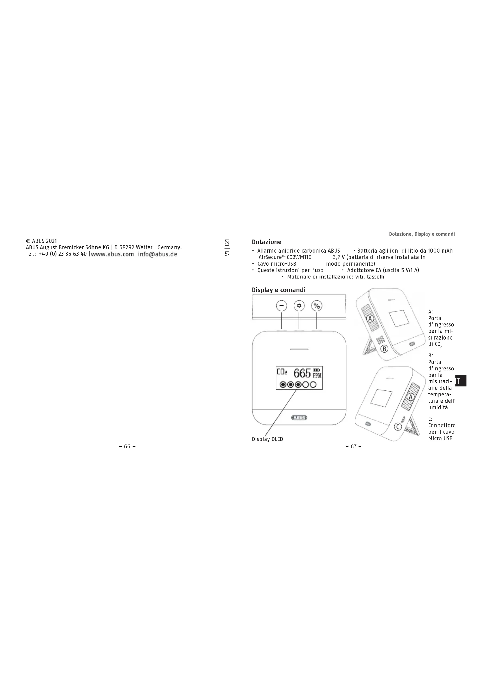 CO2WM110 è conforme alle direttive 2014/35/EU, 2014/30/EU e 2011/65/EU. La dichiarazione di conformità UE completa può essere richiesta all‘indirizzo: info@abus.de Ci riserviamo il diritto di apportare modiche tecniche. Per errori e refusi di stampa non ci si assume alcuna responsabilità. © ABUS 2021 ABUS August Bremicker Söhne KG | D 58292 Wetter | Germany. Tel.: +49 (0) 23 35 63 40 | | WEEE-Reg.-Nr. DE79663011 IT– 82 – – 83 – Volumen de entrega, Pantalla y controles Volumen de entrega