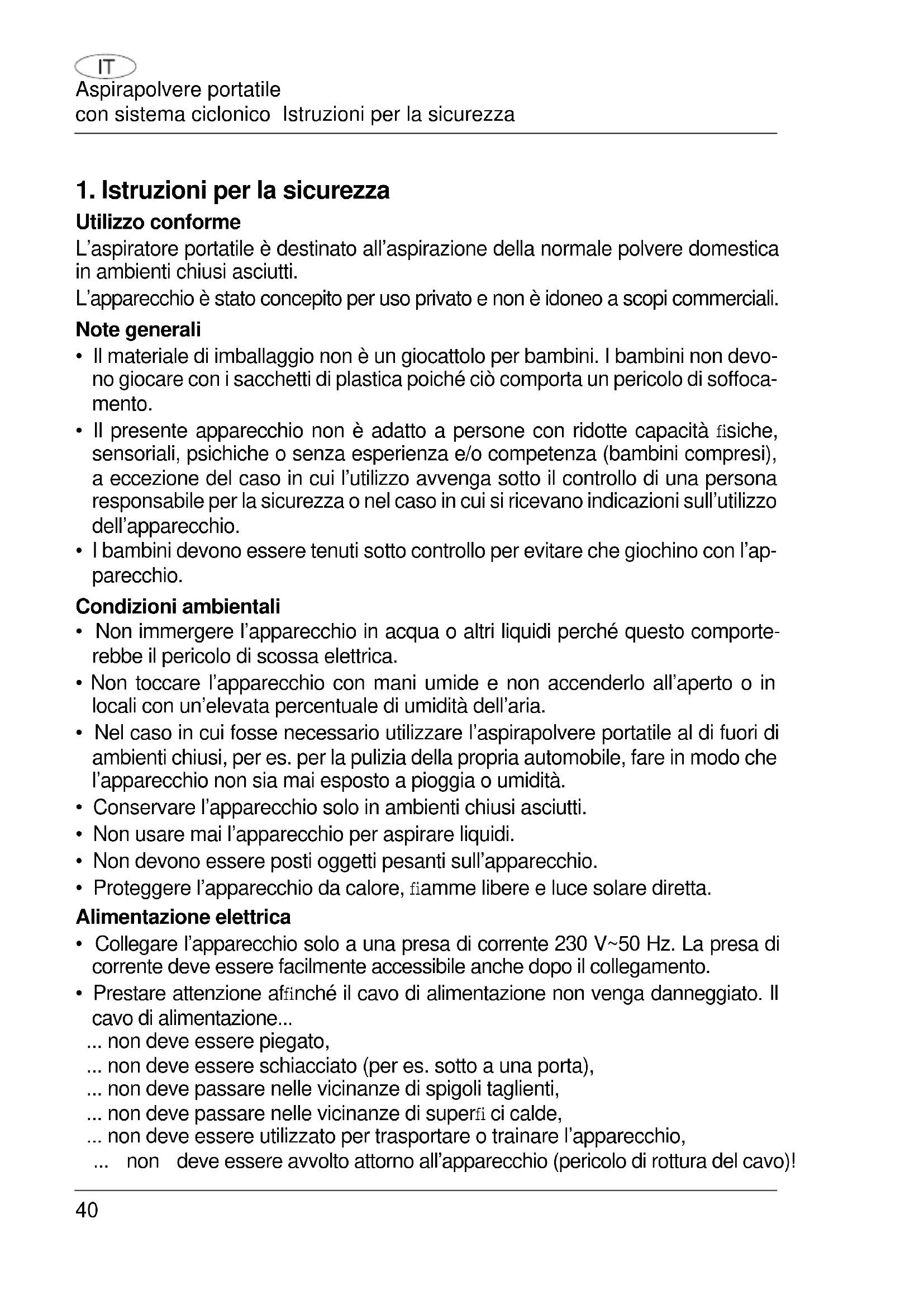 Utilizzo conforme L’aspiratore portatile è destinato all’aspirazione della normale polvere domestica in ambienti chiusi asciutti. L’apparecchio è stato concepito per uso privato e non è idoneo a scopi commerciali. Note generali