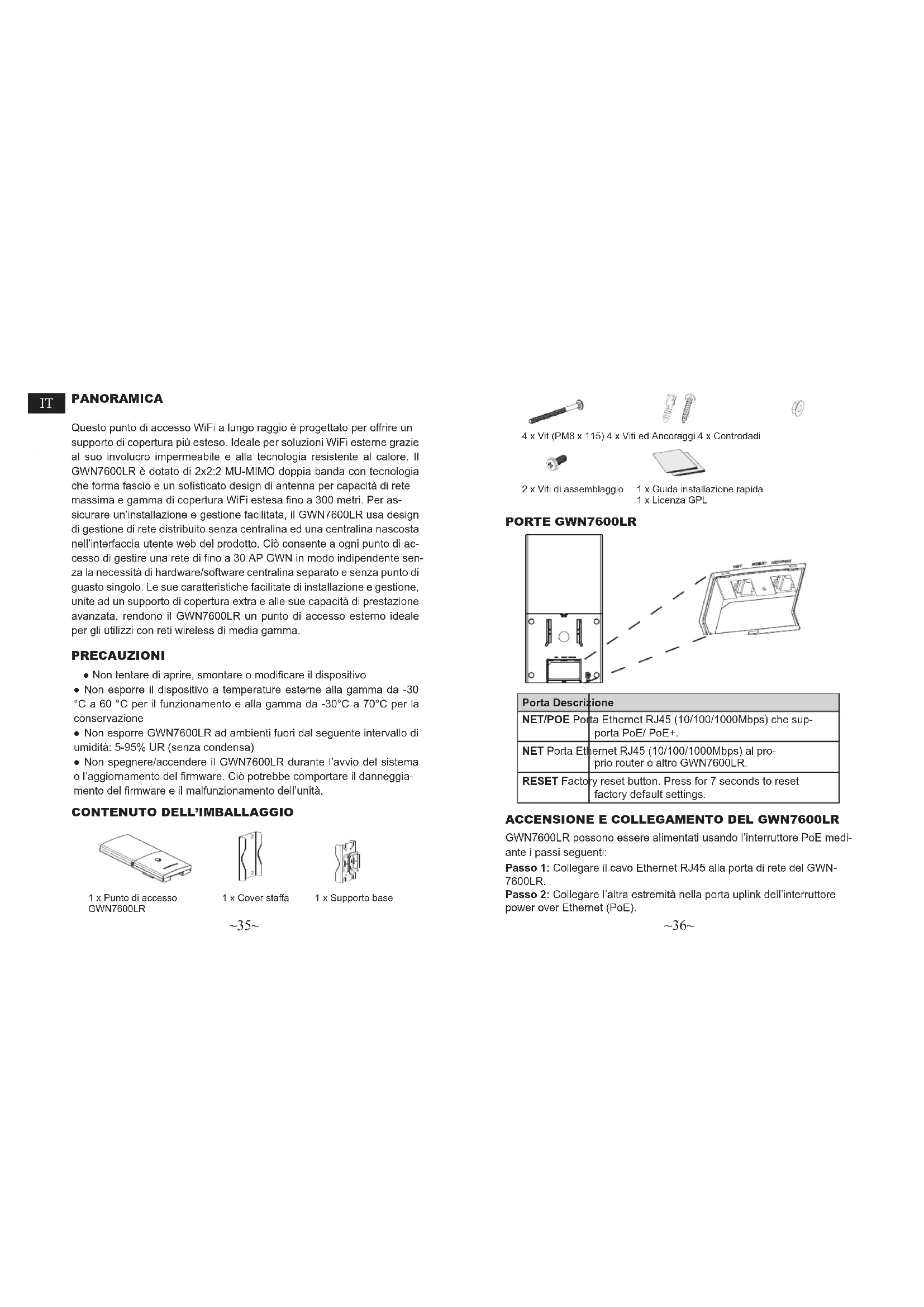 GWN7600LR possono essere alimentati usando l’interruttore PoE medi- ante i passi seguenti: Passo 1: Collegare il cavo Ethernet RJ45 alla porta di rete del GWN- 7600LR. Passo 2: Collegare l’altra estremità nella porta uplink dell’interruttore power over Ethernet (PoE). PANORAMICA Questo punto di accesso WiFi a lungo raggio è progettato per orire un supporto di copertura più esteso. Ideale per soluzioni WiFi esterne grazie al suo involucro impermeabile e alla tecnologia resistente al calore. Il GWN7600LR è dotato di 2x2:2 MU-MIMO doppia banda con tecnologia che forma fascio e un sosticato design di antenna per capacità di rete massima e gamma di copertura WiFi estesa no a 300 metri. Per as- sicurare un’installazione e gestione facilitata, il GWN7600LR usa design di gestione di rete distribuito senza centralina ed una centralina nascosta nell’interfaccia utente web del prodotto. Ciò consente a ogni punto di ac- cesso di gestire una rete di no a 30 AP GWN in modo indipendente sen- za la necessità di hardware/software centralina separato e senza punto di guasto singolo. Le sue caratteristiche facilitate di installazione e gestione, unite ad un supporto di copertura extra e alle sue capacità di prestazione avanzata, rendono il GWN7600LR un punto di accesso esterno ideale per gli utilizzi con reti wireless di media gamma. 1 x Punto di accesso GWN7600LR 1 x Guida installazione rapida 1 x Licenza GPL 4 x Vit (PM8 x 115) 4 x Viti ed Ancoraggi 4 x Controdadi 1 x Supporto base