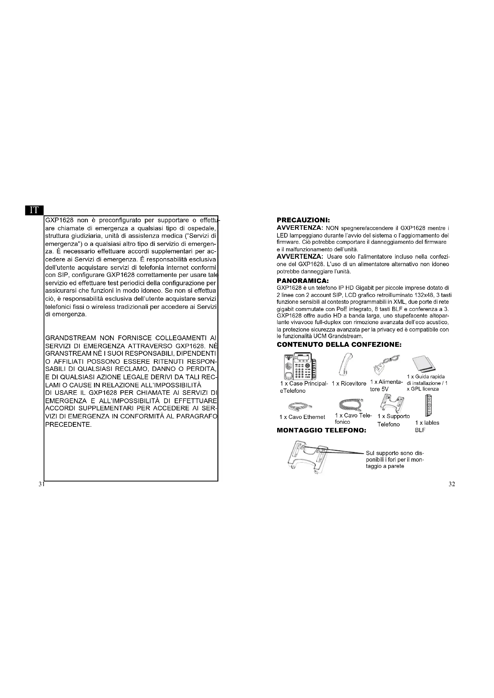 GXP1628 è un telefono IP HD Gigabit per piccole imprese dotato di 2 linee con 2 account SIP, LCD grafico retroilluminato 132x48, 3 tasti funzione sensibili al contesto programmabili in XML, due porte di rete gigabit commutate con PoE integrato, 8 tasti BLF e conferenza a 3. GXP1628 offre audio HD a banda larga, uno stupefacente altopar- lante vivavoce full-duplex con rimozione avanzata dell’eco acustico, la protezione sicurezza avanzata per la privacy ed è compatibile con le funzionalità UCM Grandstream. CONTENUTO dELLA CONFEZIONE: PANORAMICA: PRECAUZIONI: AvvERTENZA: NON spegnere/accendere il GXP1628 mentre i LED lampeggiano durante l’avvio del sistema o l’aggiornamento del firmware. Ciò potrebbe comportare il danneggiamento del firmware e il malfunzionamento dell’unità. AvvERTENZA: Usare solo l’alimentatore incluso nella confezi- one del GXP1628. L’uso di un alimentatore alternativo non idoneo potrebbe danneggiare l’unità. 1 x Cavo Tele- fonico 1 x Cavo Ethernet 1 x Supporto Telefono 1 x Ricevitore 1 x Alimenta- tore 5V 1 x Guida rapida di installazione / 1 x GPL licenza 1 x Case Principal- eTelefono 5 V MONTAGGIO TELEFONO: Sul supporto sono dis- ponibili i fori per il mon- taggio a parete 1 x lables BLF33 Installazione del telefono (supporto telefono): Installazione del telefono (montaggio a parete): CONNESSIONE dEL TELEFONO: